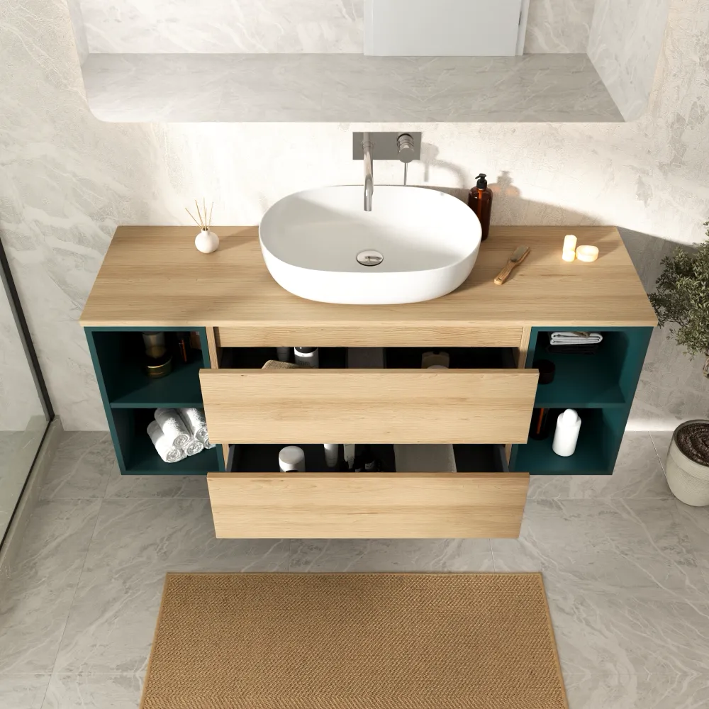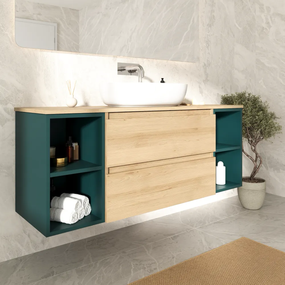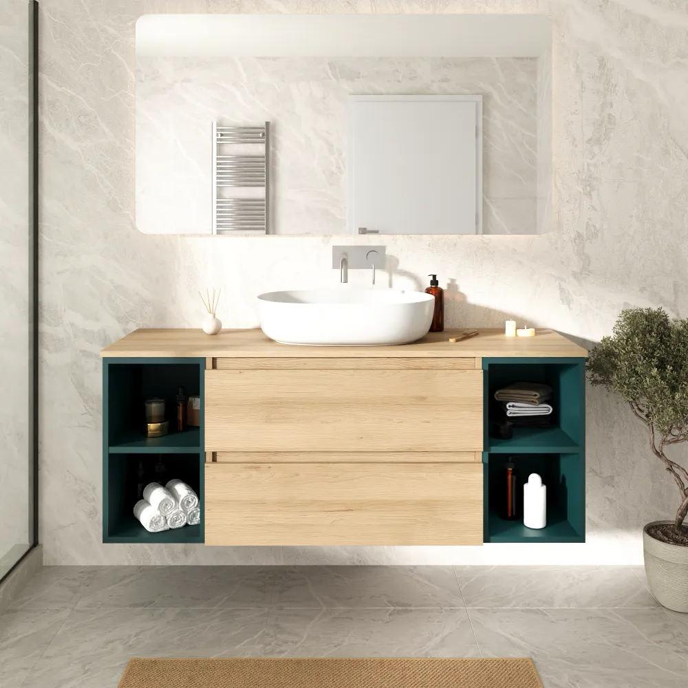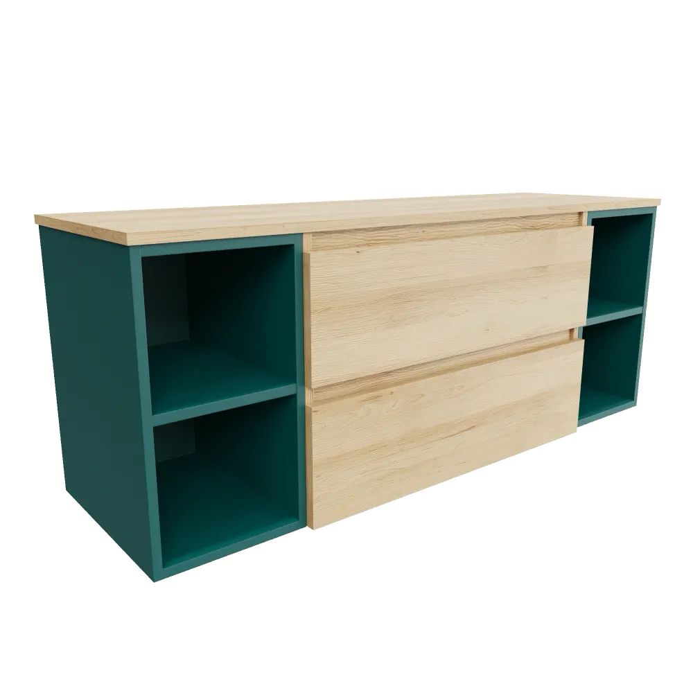 Mobile bagno sospeso 140cm due cassetti rovere chiaro stone oak e due vani a giorno petrol con top | Hexa