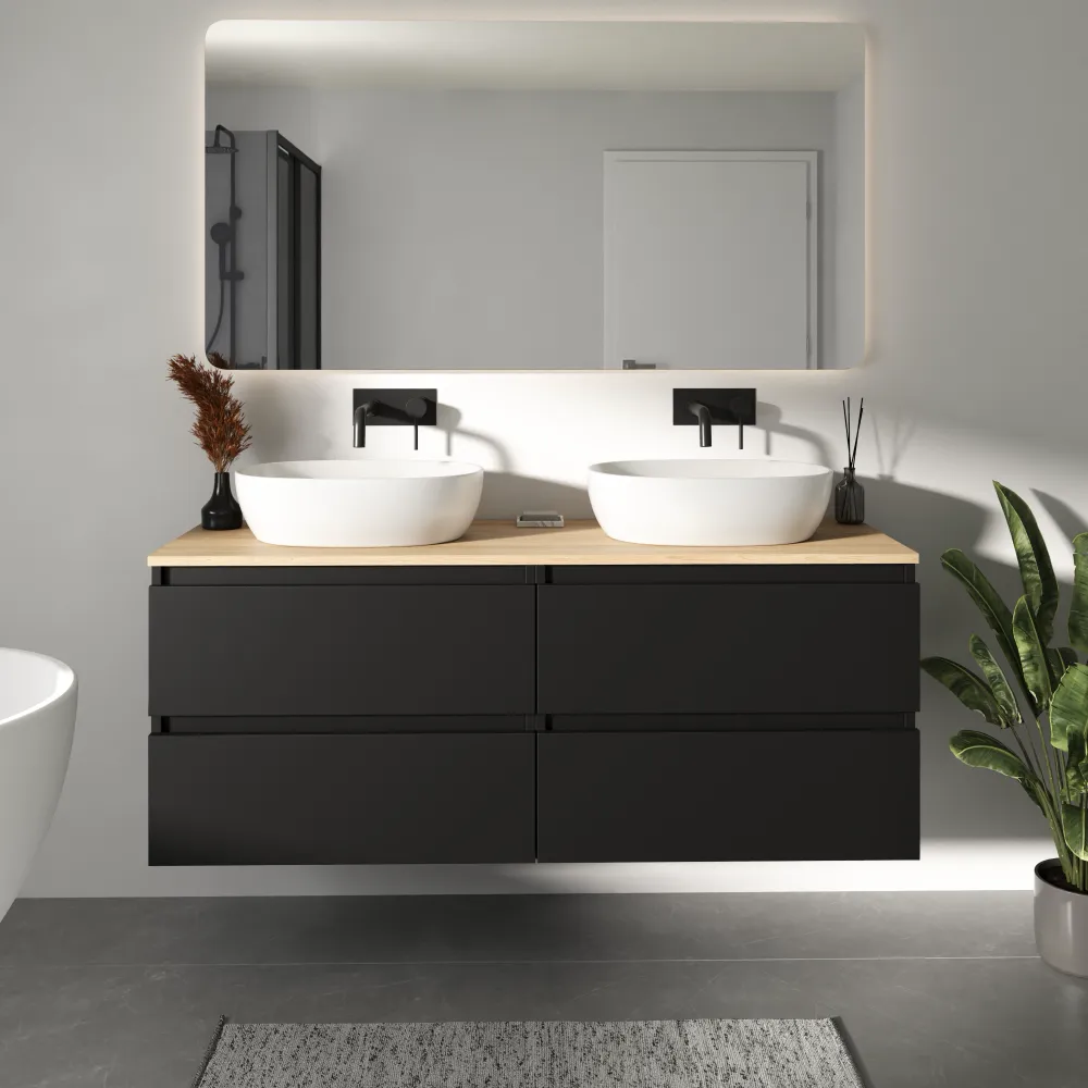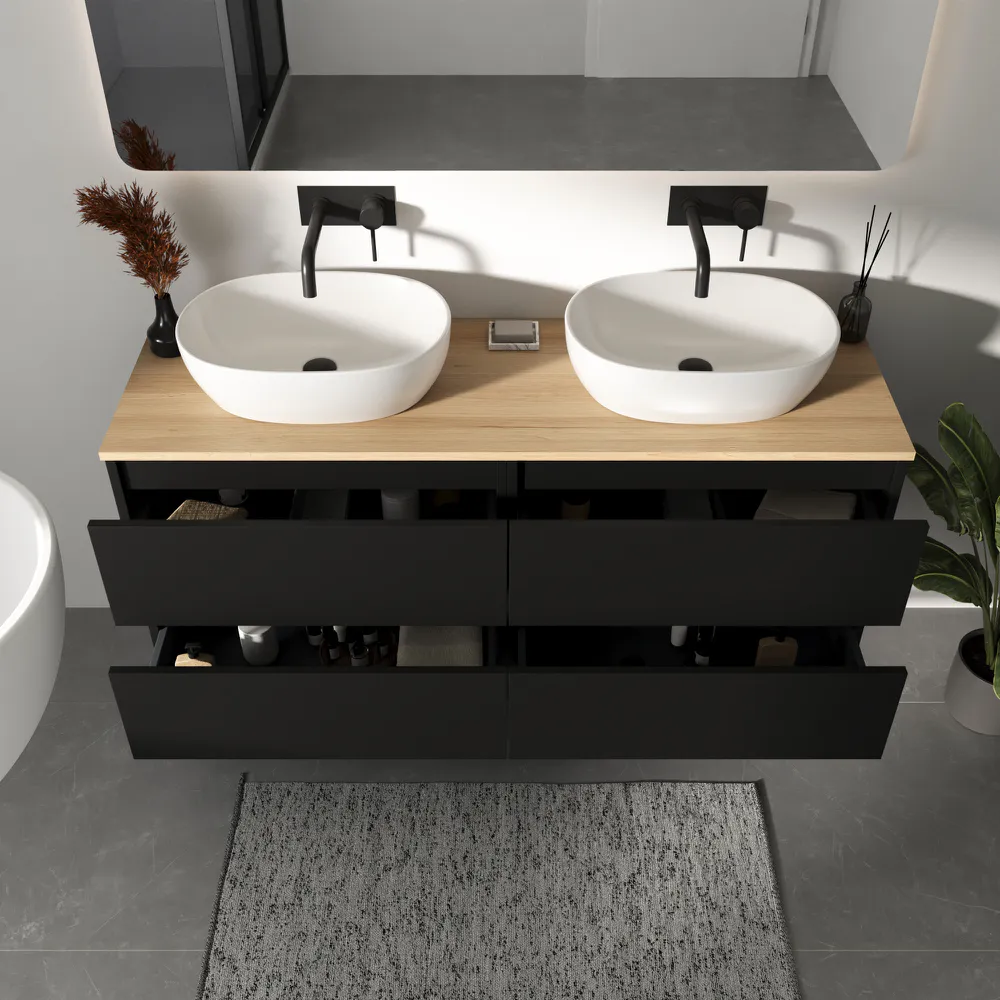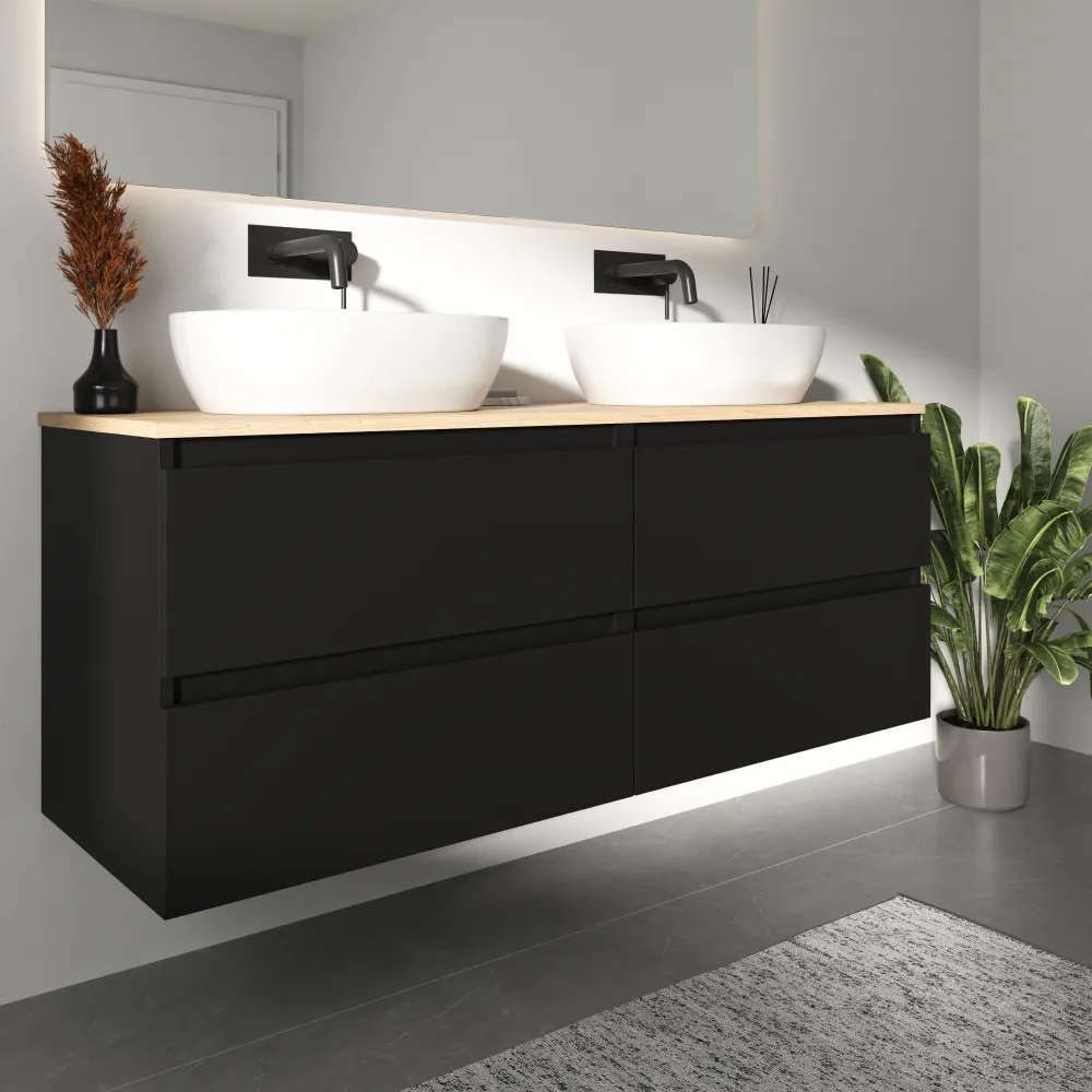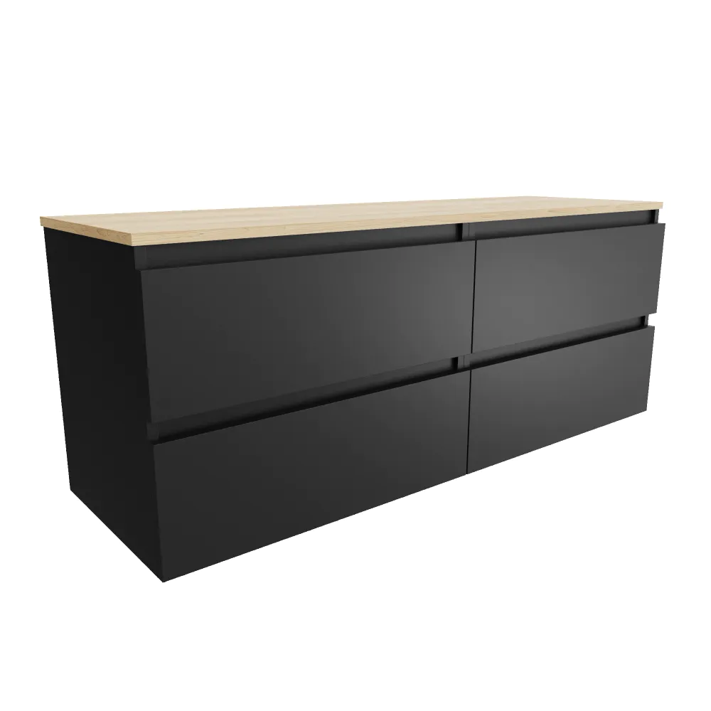 Mobile bagno sospeso 140cm quattro cassetti nero opaco con top rovere chiaro | Hexa