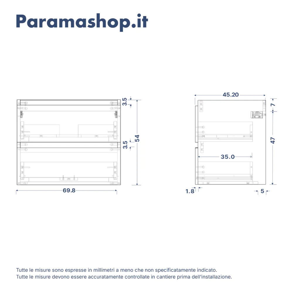 La composizione è formata da due mobili da 70 cm, ciascuno dotato di due cassetti con guide Hettich di ultima generazione, garantendo scorrevolezza, resistenza e chiusura soft-close.