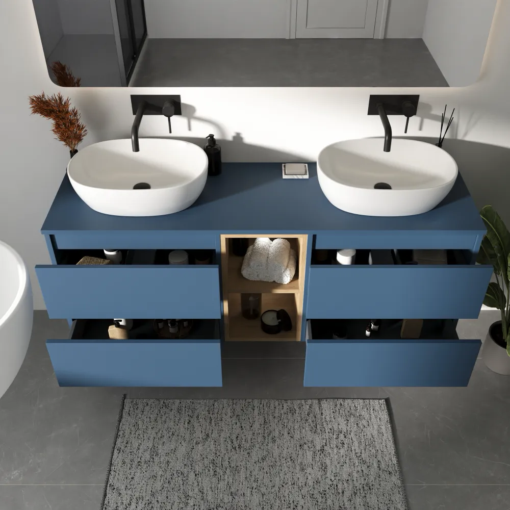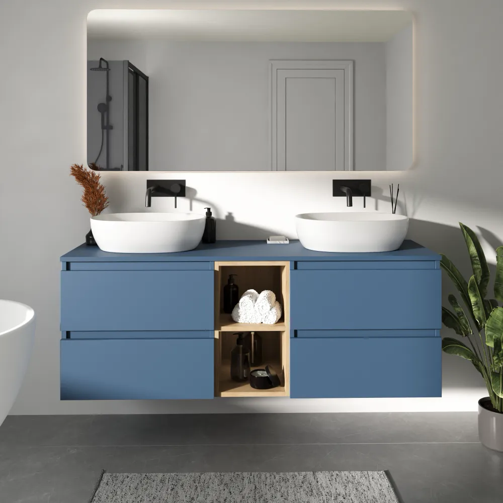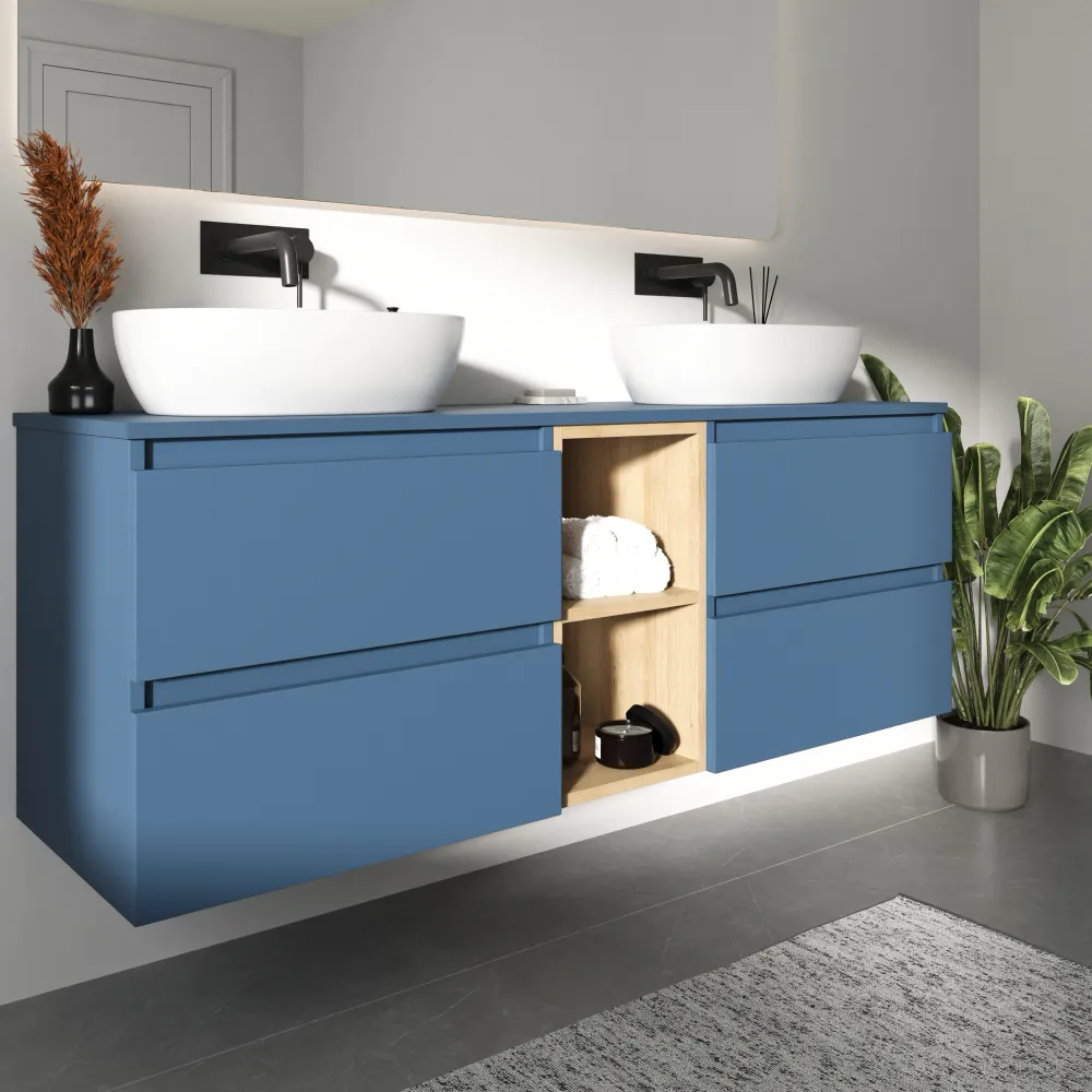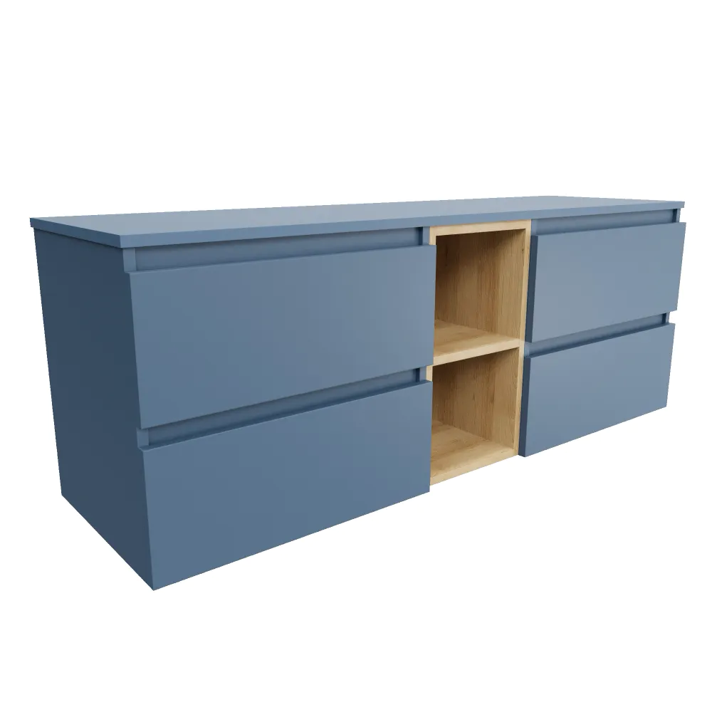 Mobile bagno sospeso 150cm quattro cassetti con top alby blue e vano a giorno rovere chiaro stone oak | Hexa