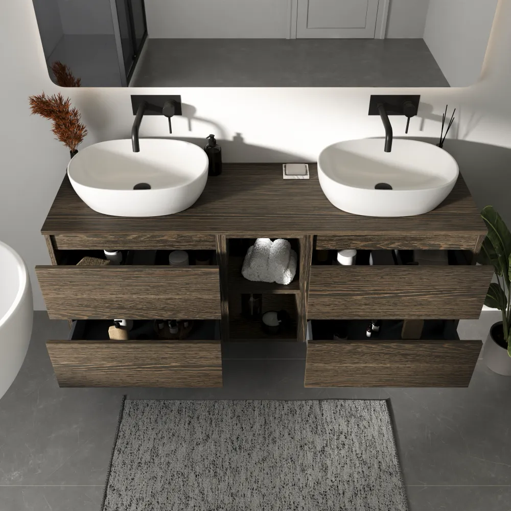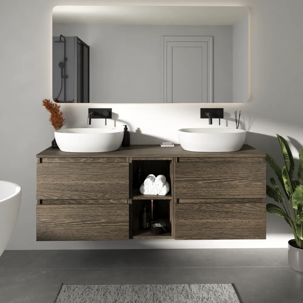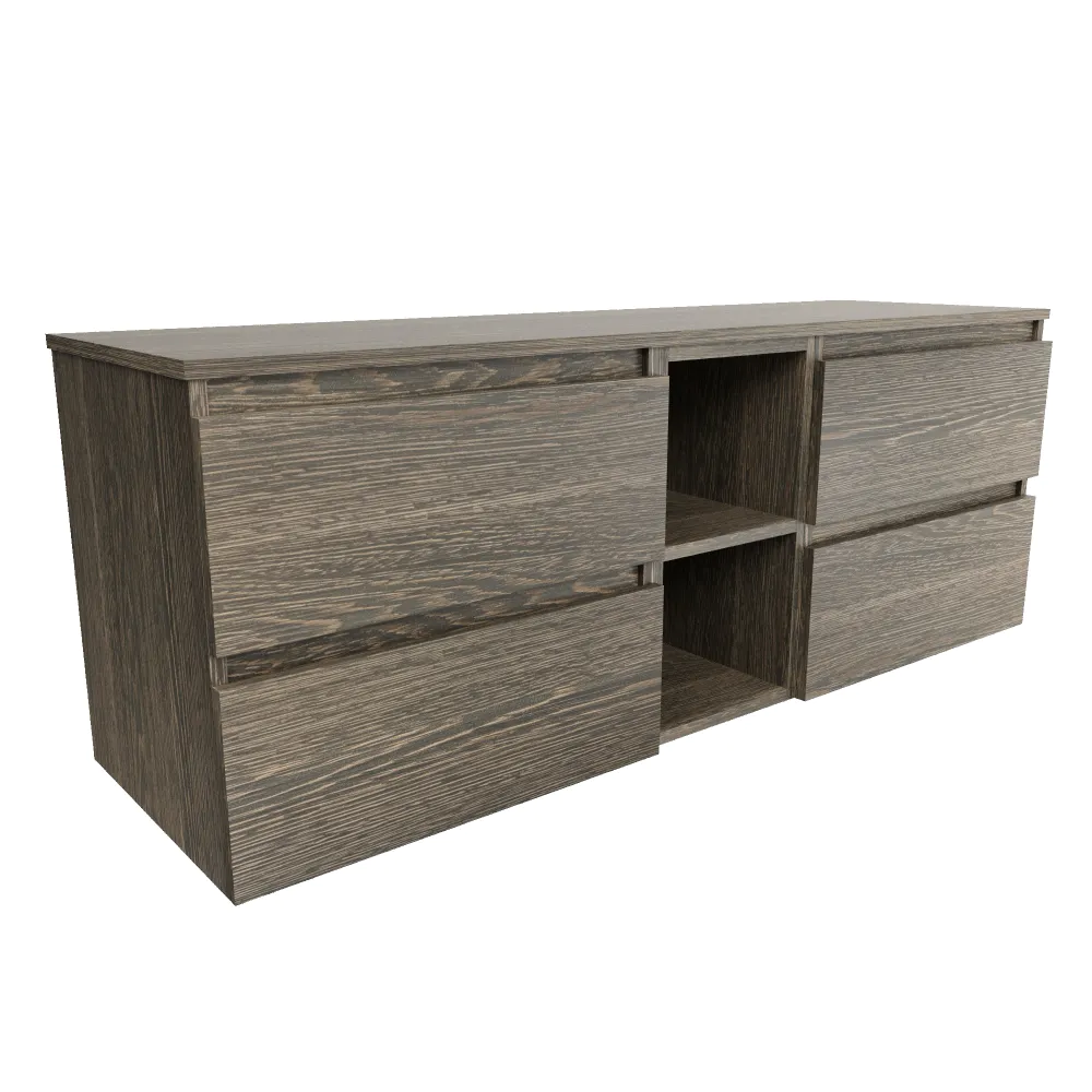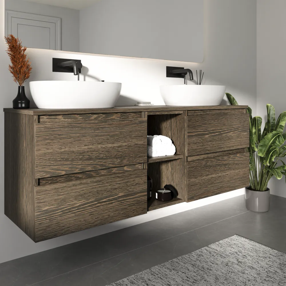Mobile bagno sospeso 150cm quattro cassetti con top e vano a giorno rovere scuro vintage wenge | Hexa