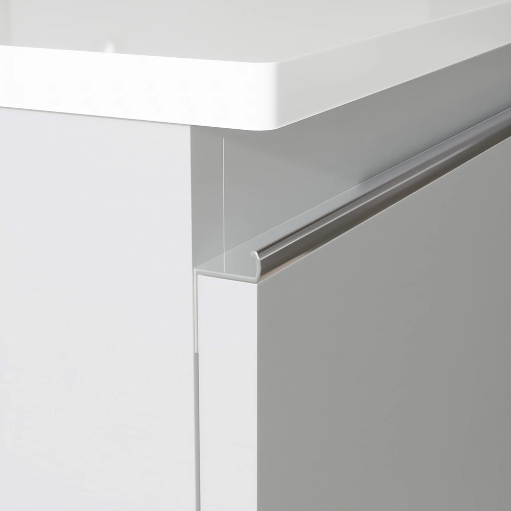 Il lavabo in ceramica bianco lucido, integrato nella struttura del mobile, è caratterizzato da una forma essenziale e da una superficie liscia e facile da pulire, che dona al tuo bagno un tocco di eleganza senza tempo.