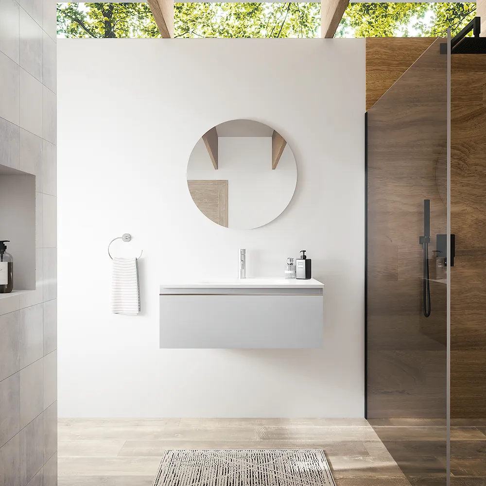 Il singolo cassetto, dotato di chiusura rallentata, è ampio e profondo, offrendo tutto lo spazio necessario per organizzare al meglio i tuoi prodotti per l'igiene personale. La maniglia in metallo, dal design lineare ed essenziale, completa l'estetica del mobile e garantisce una presa sicura e confortevole.