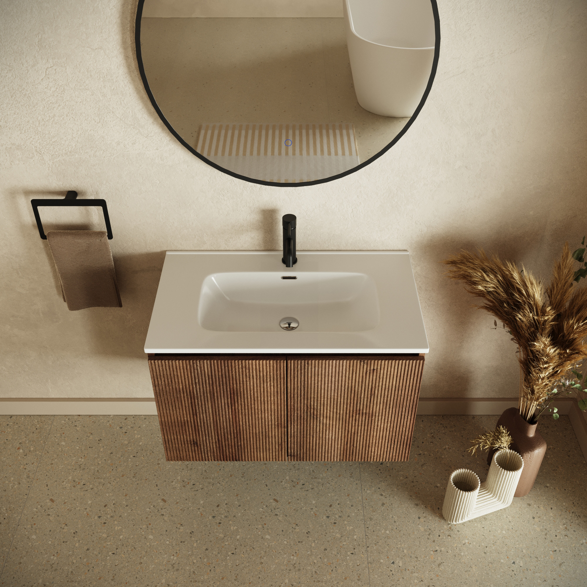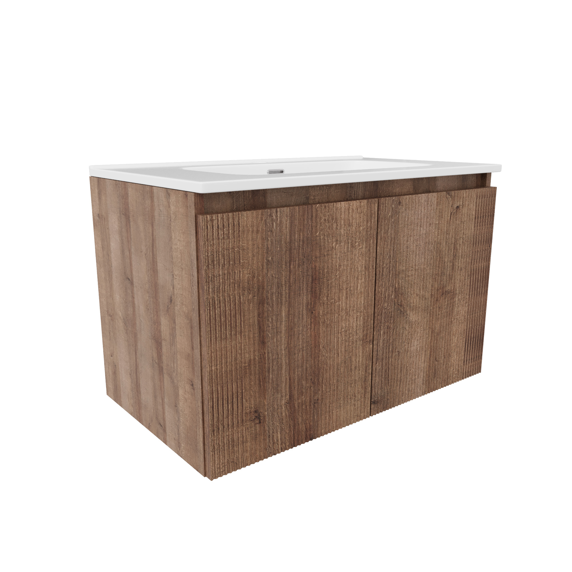 Mobile bagno sospeso 60cm due ante rovere scuro cannettato con lavabo | Pelion