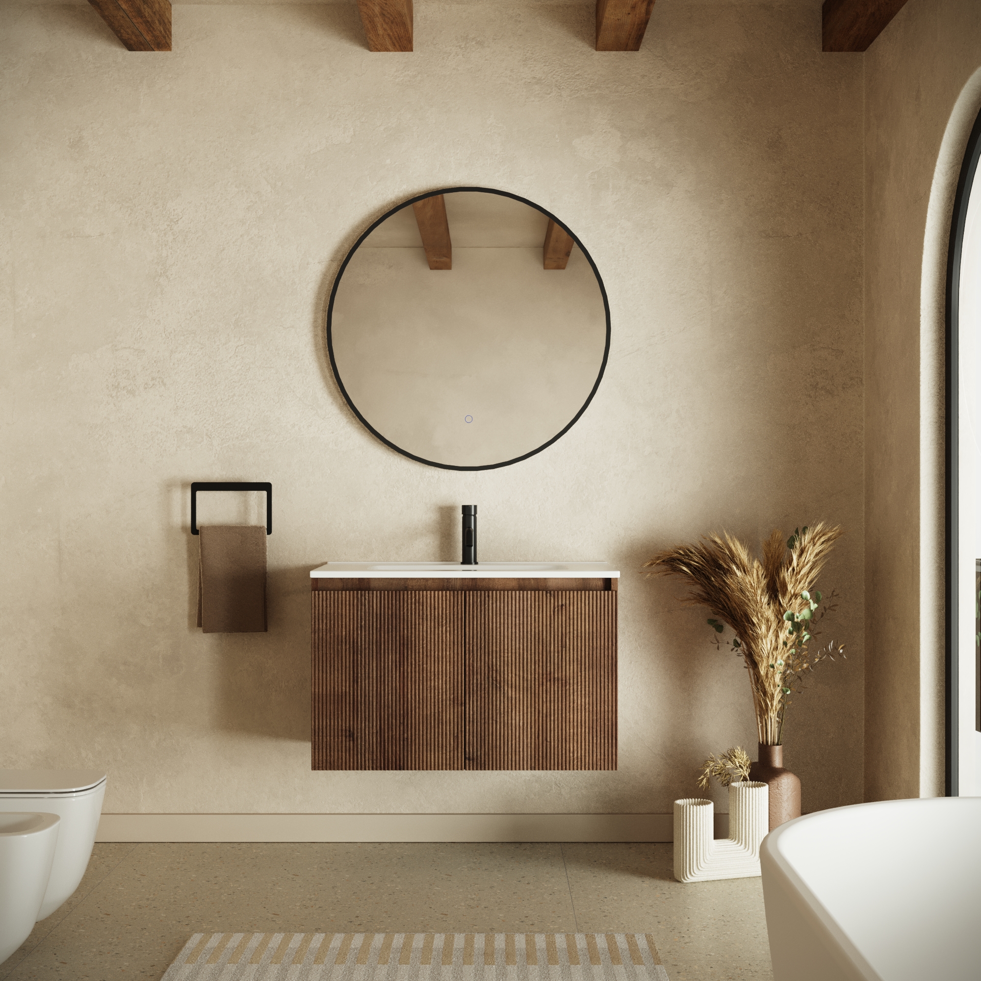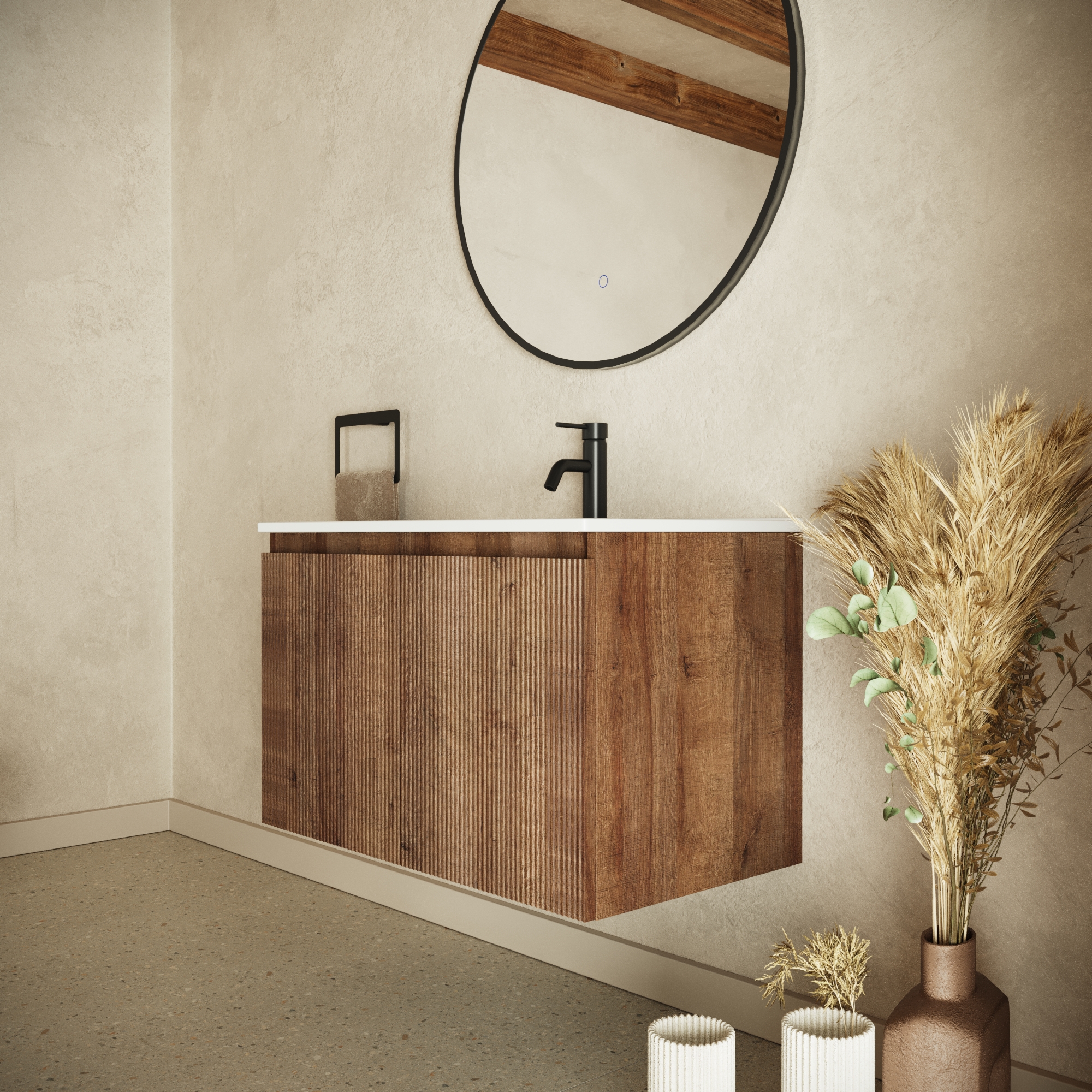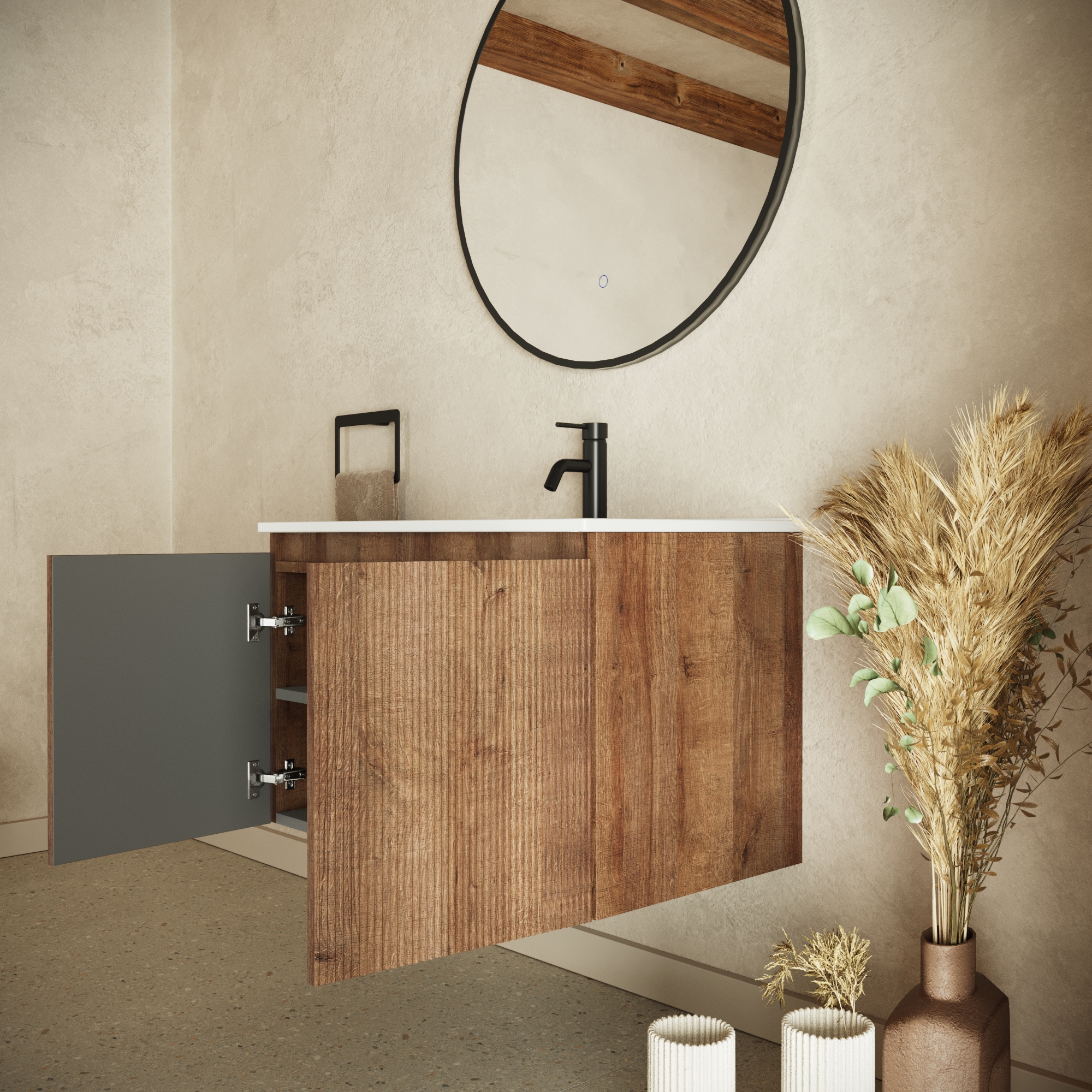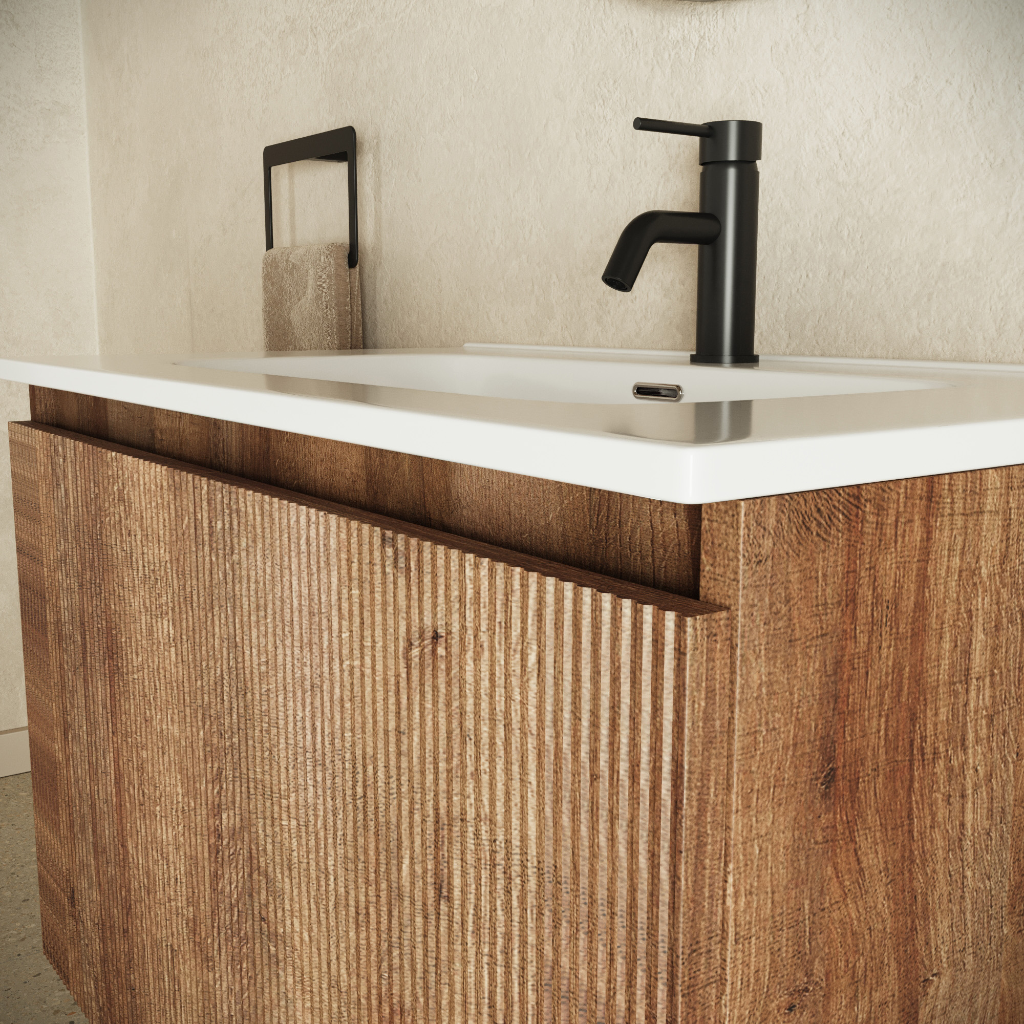 Il frontale cannettato rappresenta l'elemento distintivo di questa serie, creando un elegante gioco di luci e ombre che dona carattere e personalità al mobile. Questa texture sofisticata, abbinata alla finitura rovere scuro, conferisce un aspetto elegante e raffinato che dona profondità e carattere all'ambiente bagno, creando un'atmosfera di lusso contemporaneo che esalta le ricche venature del legno scuro.