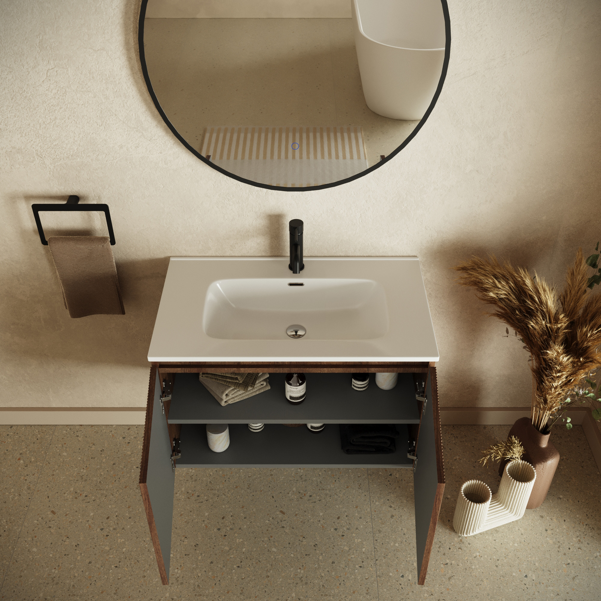 Il mobile viene fornito completo di lavabo in ceramica bianco lucido, perfettamente integrato nel design complessivo. La superficie brillante della ceramica non solo offre un elegante contrasto con la finitura in rovere scuro del mobile, ma garantisce anche facilità di pulizia e igiene, caratteristiche fondamentali per l'ambiente bagno.