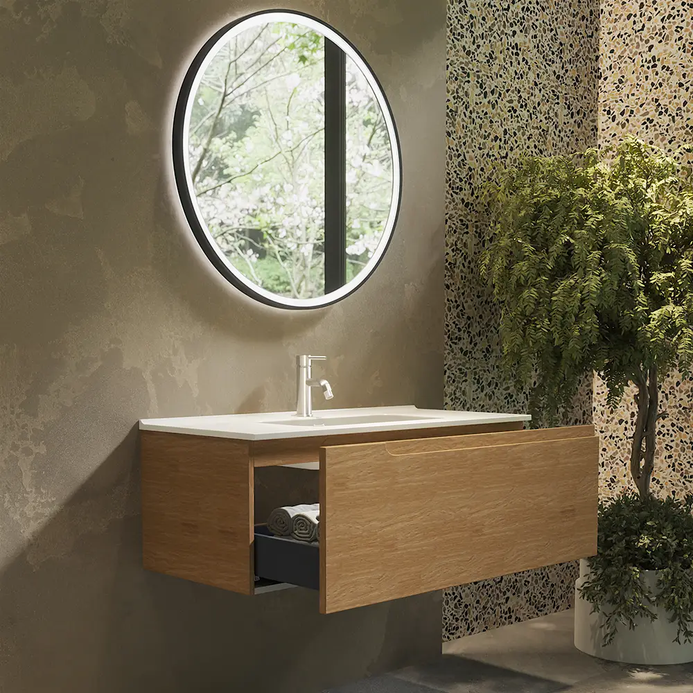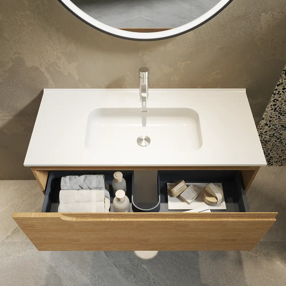 Il mobile dispone di un cassetto con la tecnologia soft close, il che significa che si chiude in modo delicato e silenzioso senza sbattere. Questa caratteristica non solo prolunga la durata del mobile, ma evita chiusure accidentali e per garantire un'esperienza d'uso sicura e confortevole.