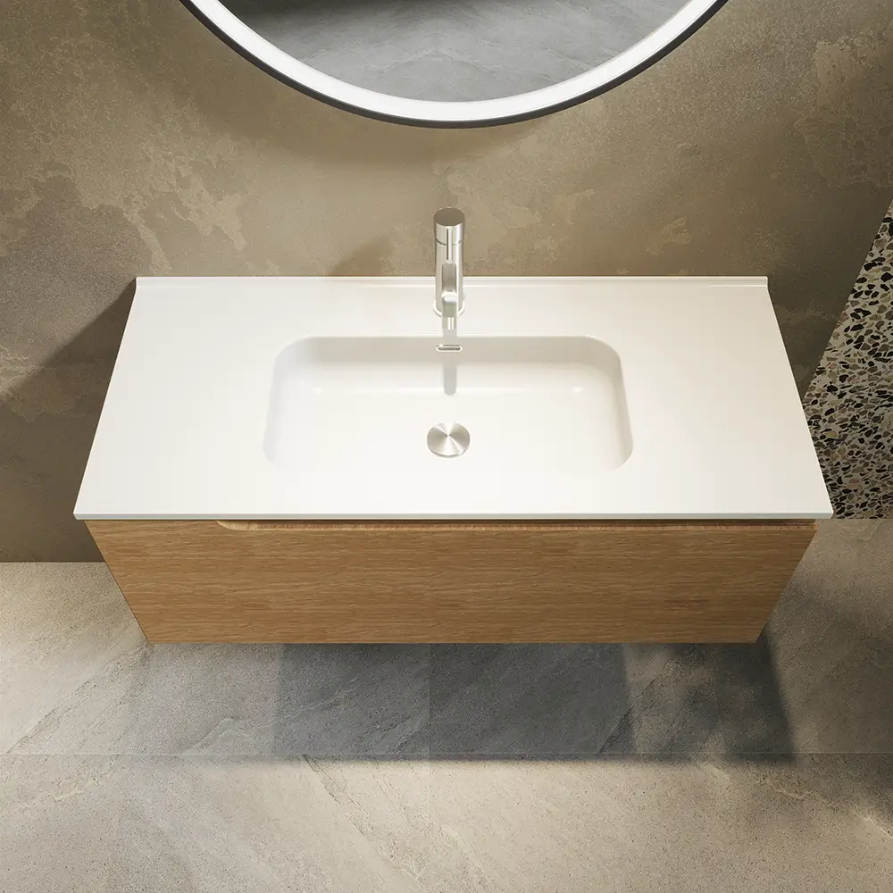 Il lavabo integrato in ceramica bianco lucido, robusto e facile da pulire, si fonde armoniosamente con la base del mobile, offrendo un'ampia area di utilizzo. Ogni dettaglio è curato con attenzione, aggiungendo un tocco di lusso al vostro spazio bagno.