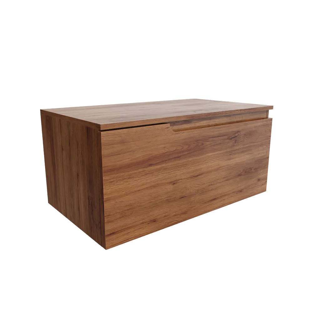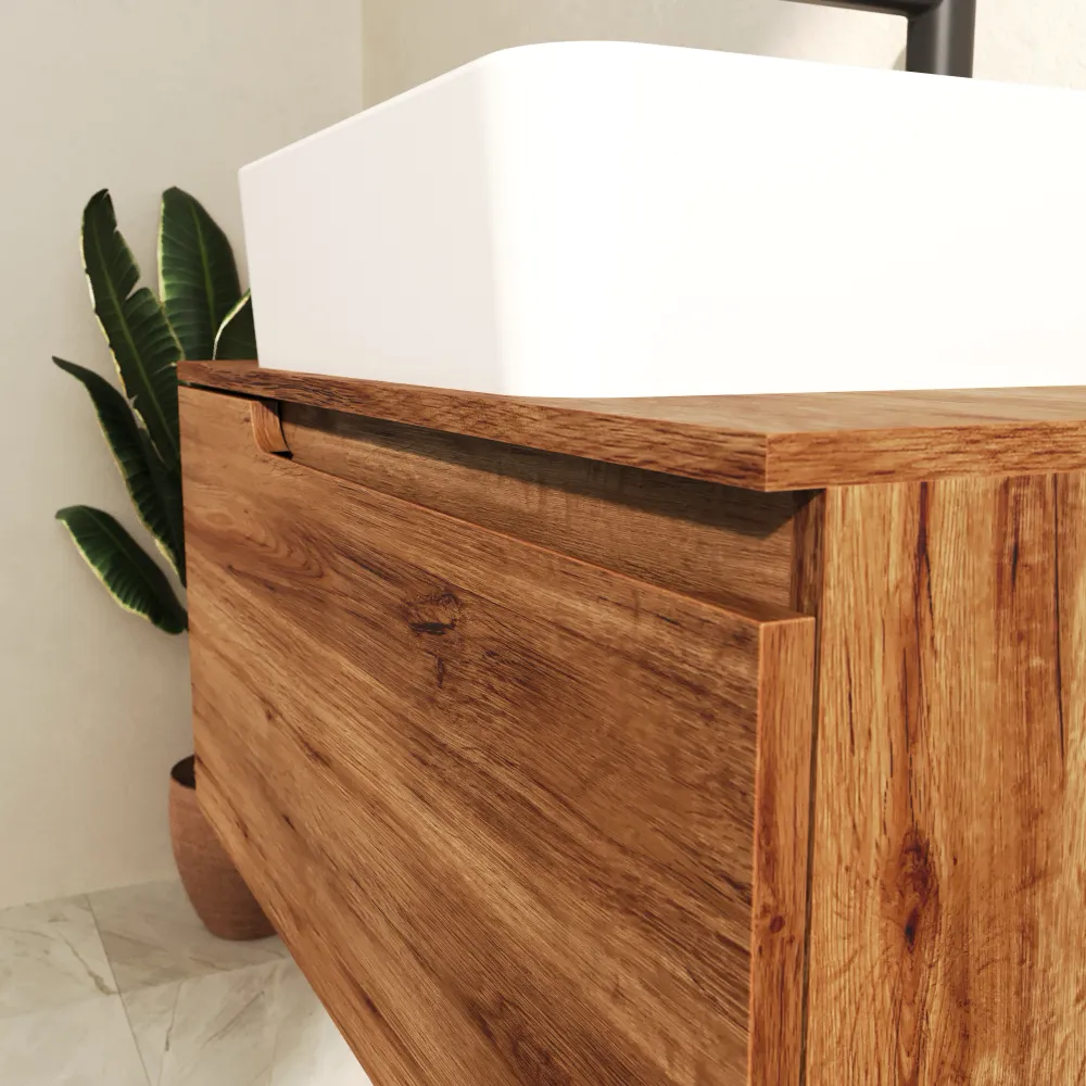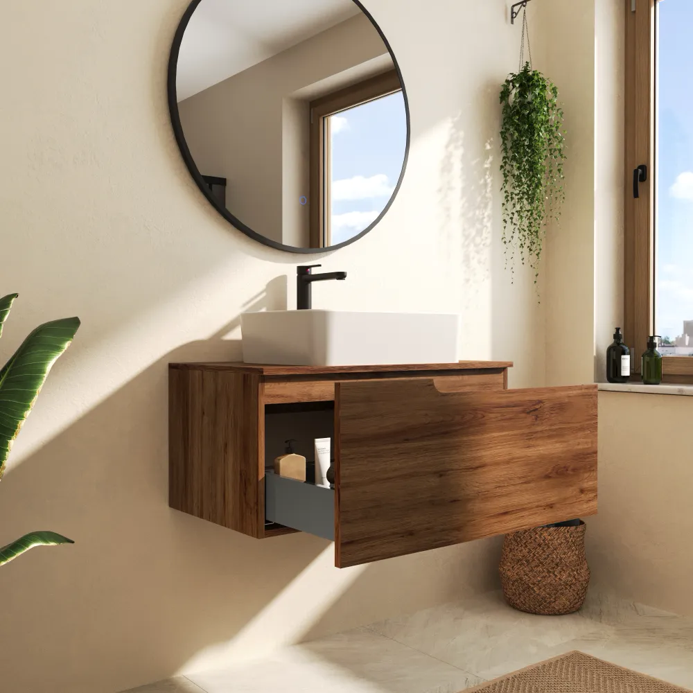 Il mobile bagno sospeso 70 cm in rovere scuro con un cassetto combina design moderno e funzionalità in un formato compatto. La struttura in MDF di alta qualità con frontale da 18 mm e pannelli laterali da 15 mm rivestiti in PVC offre solidità e resistenza nel tempo.