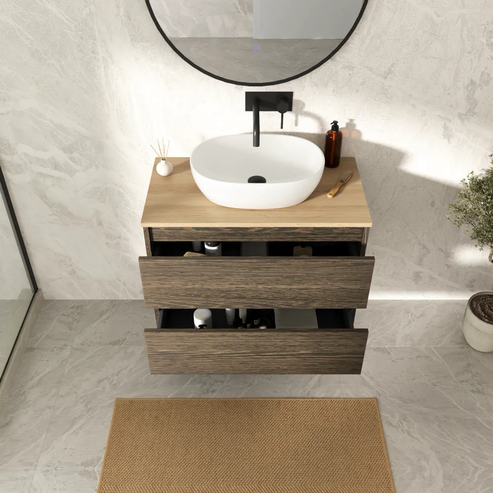 Il mobile è fornito con top in rovere chiaro, resistente e facile da pulire, pronto per essere completato con il lavabo di propria scelta. La superficie del top offre un appoggio funzionale per accessori e oggetti bagno, mantenendo un design armonioso e contemporaneo.