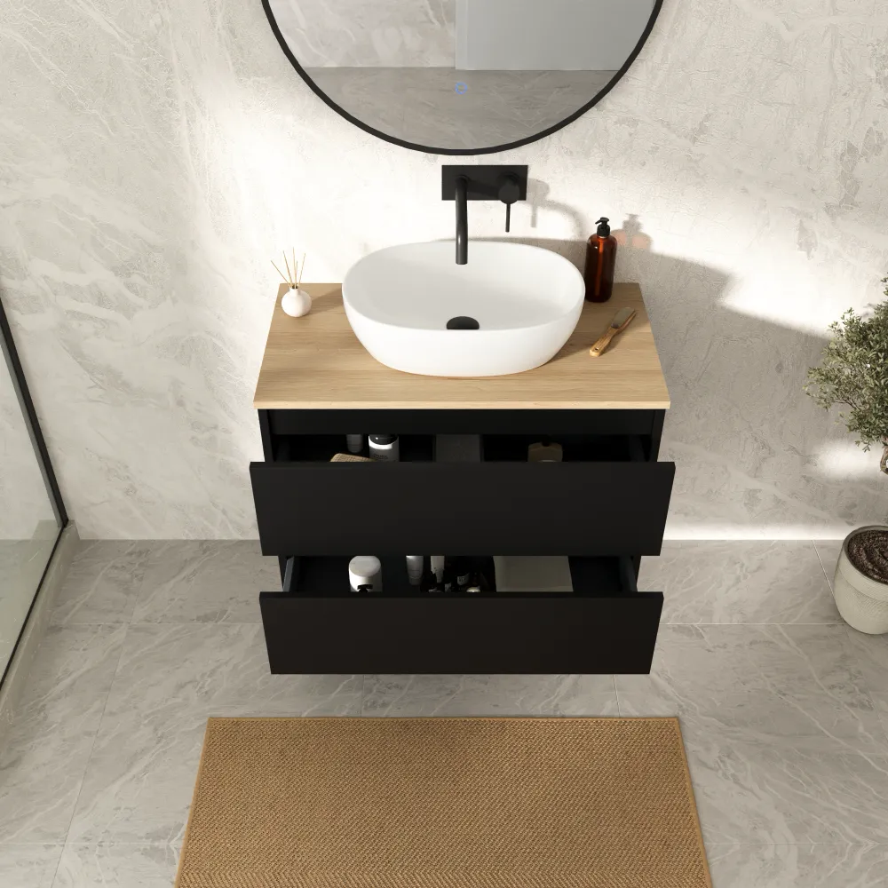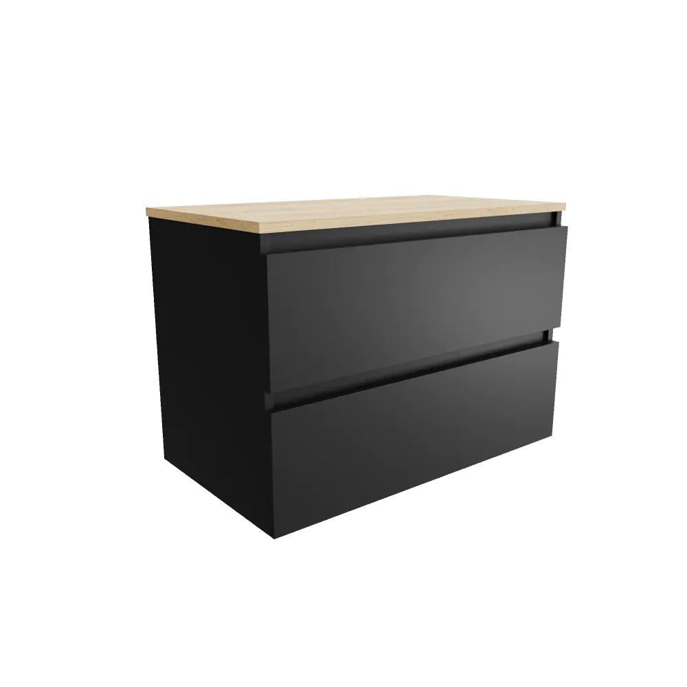 Mobile bagno sospeso 80cm due cassetti nero opaco con top rovere chiaro | Hexa