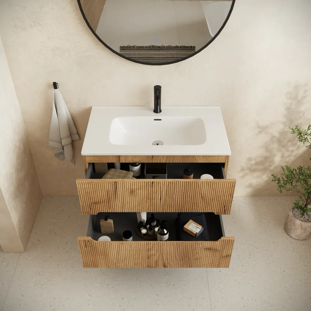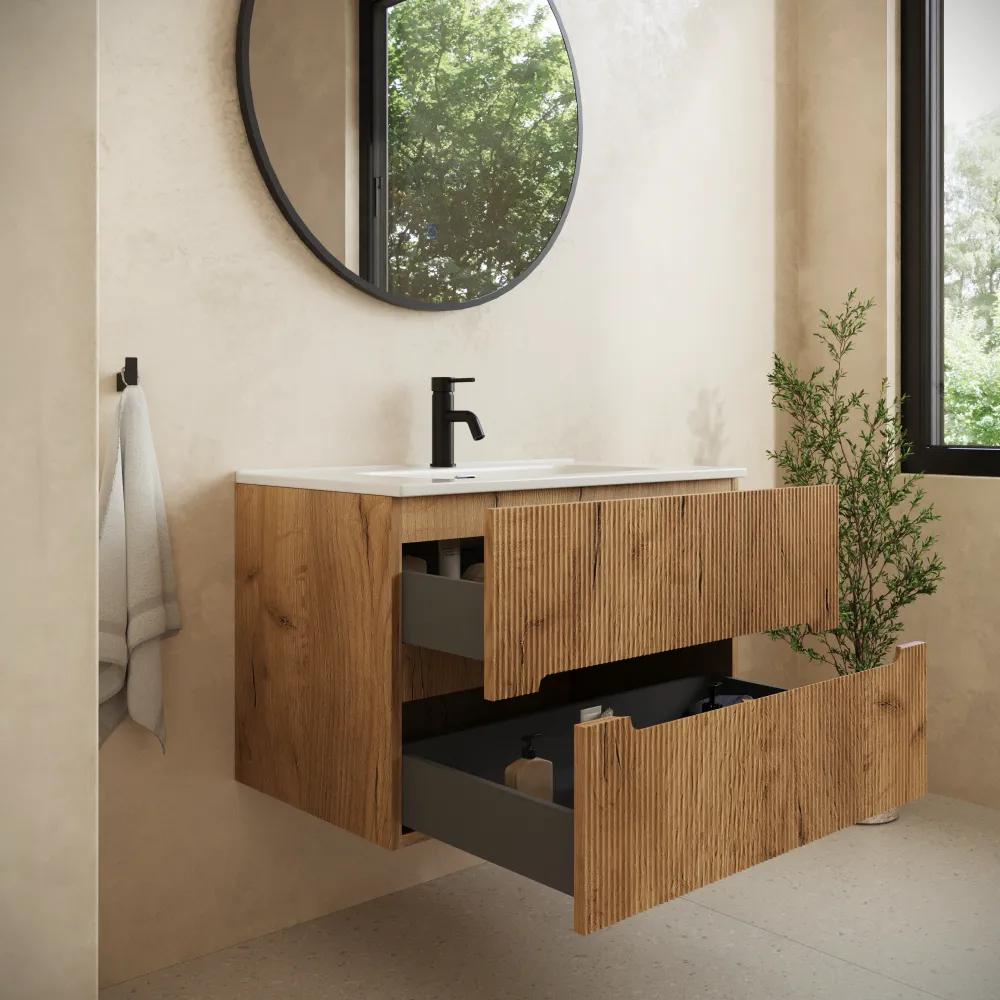 Mobile bagno sospeso 80cm due cassetti rovere chiaro cannettato con lavabo | Tigua
