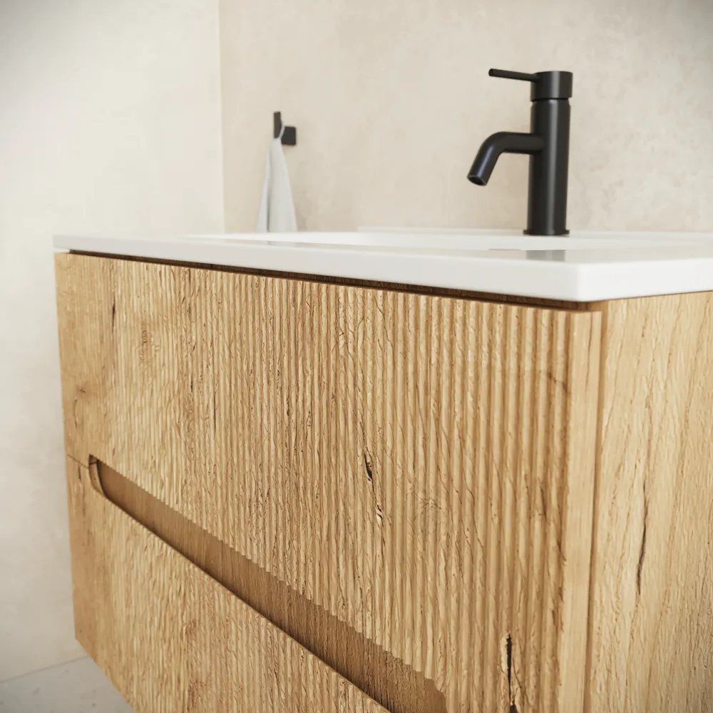 Il mobile da bagno sospeso della serie Tigua, con le sue dimensioni compatte di 80 cm, è stato progettato per chi desidera ottimizzare lo spazio senza compromessi sullo stile. Il suo design pulito e contemporaneo è esaltato dalla finitura in rovere chiaro, che dona luminosità all'ambiente. Il frontale cannettato aggiunge una texture distintiva, creando un raffinato gioco di luci e ombre che conferisce profondità e carattere.