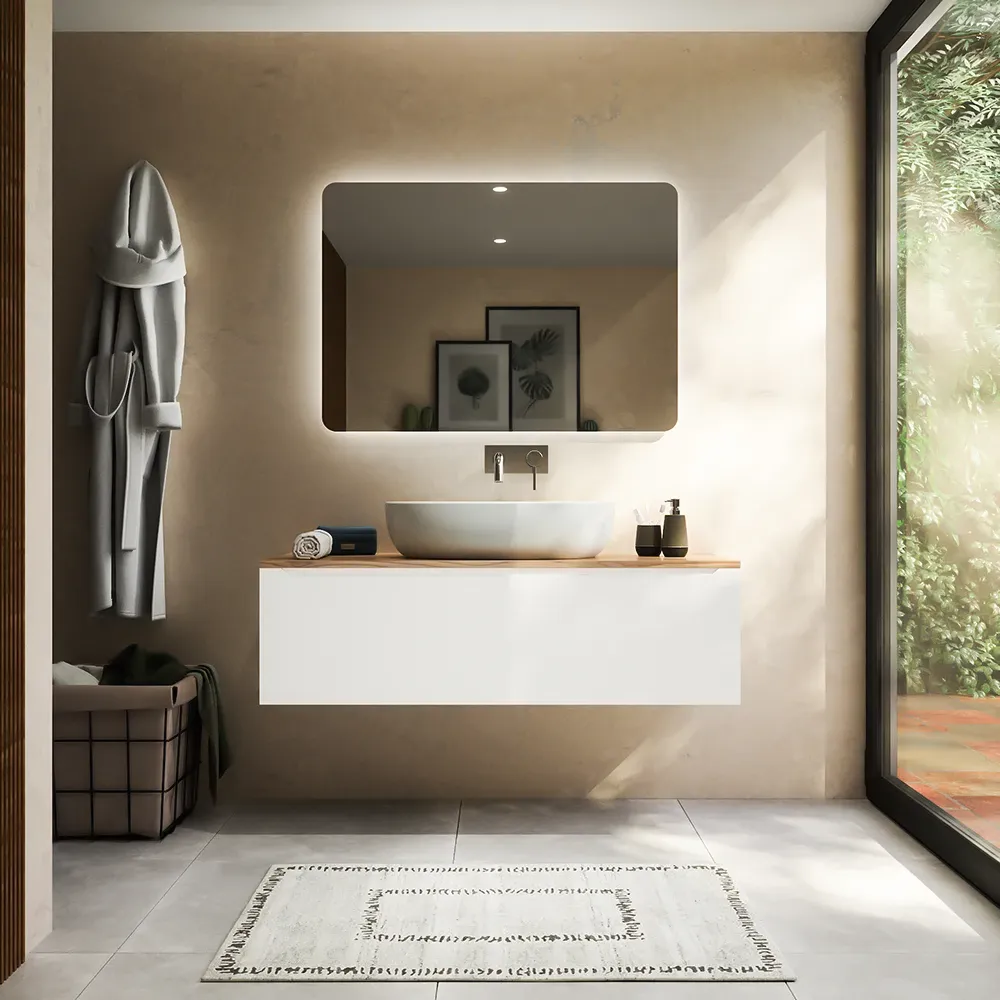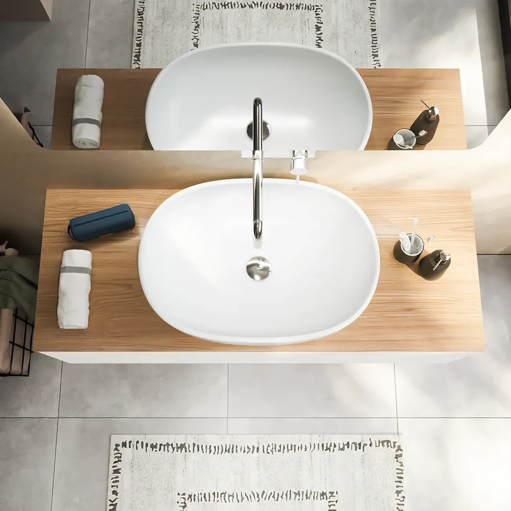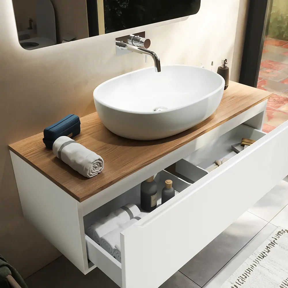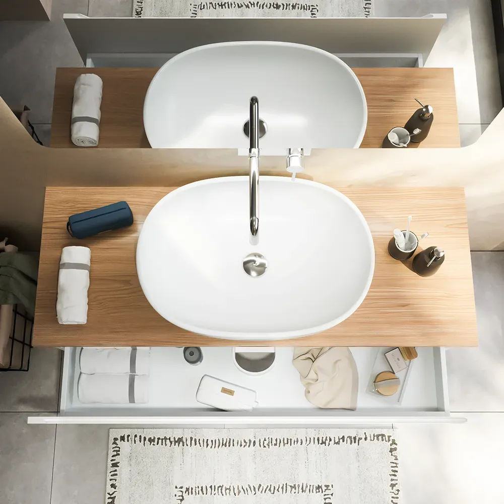 Il top in rovere chiaro abbinato offre una superficie ampia e resistente su cui posizionare il lavabo d'appoggio che preferisci, creando un ambiente bagno unico e personalizzato.