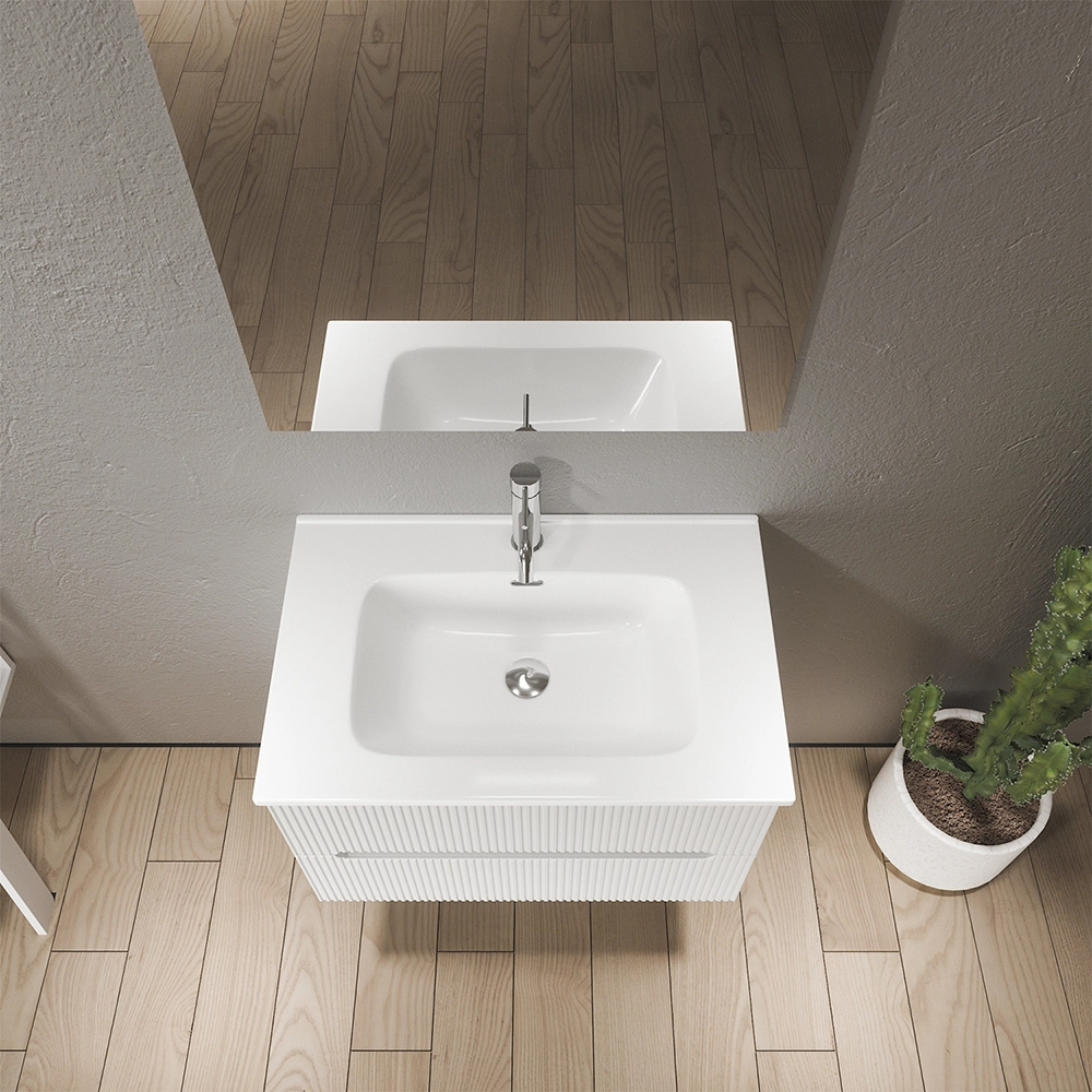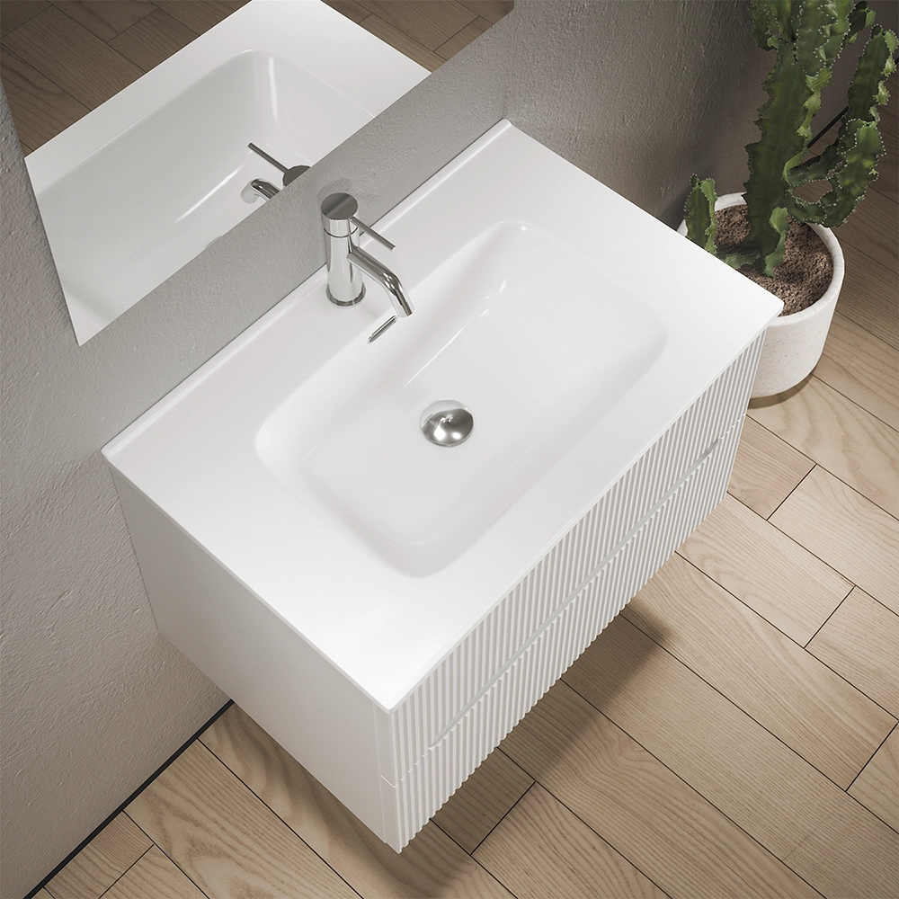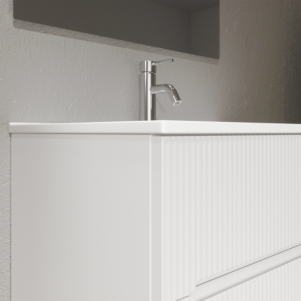 Mobile bagno sospeso 90cm cannettato bianco opaco con lavabo in ceramica e specchio | Kaindy