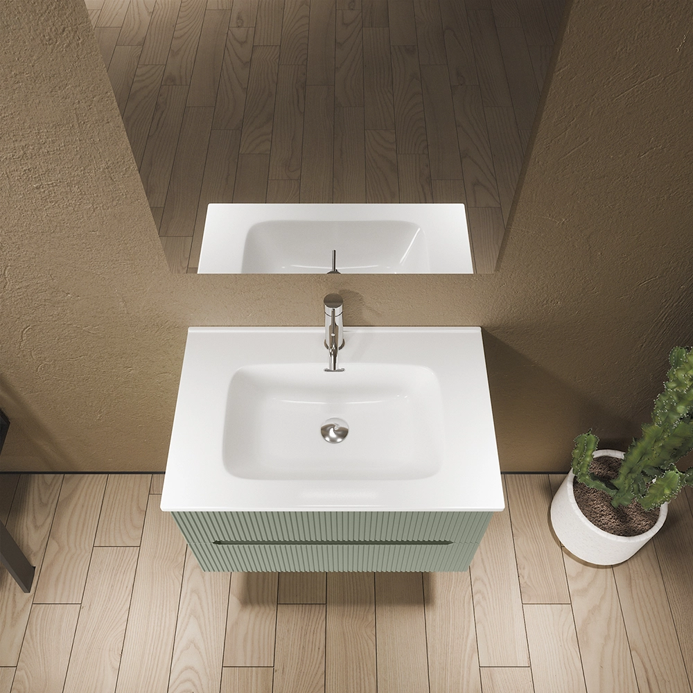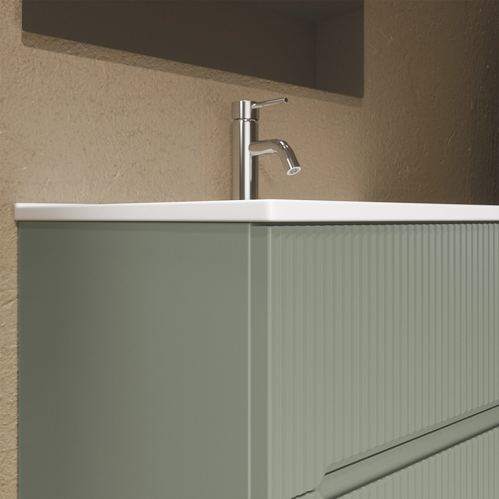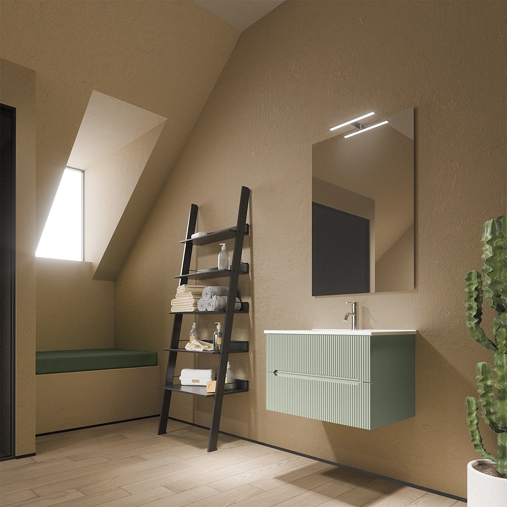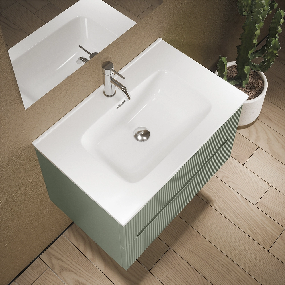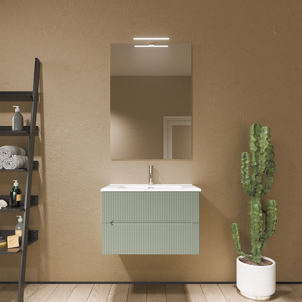 Mobile bagno sospeso 90cm cannettato verde opaco con lavabo in ceramica e specchio | Kaindy