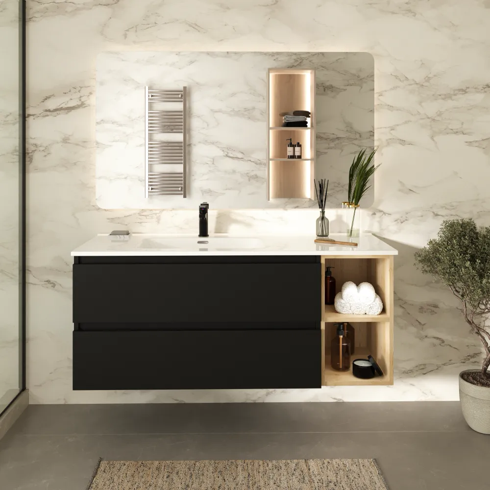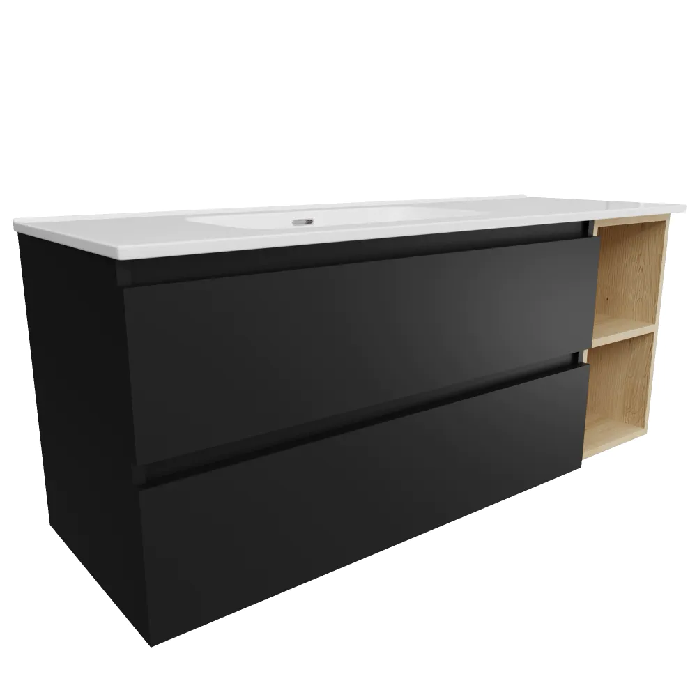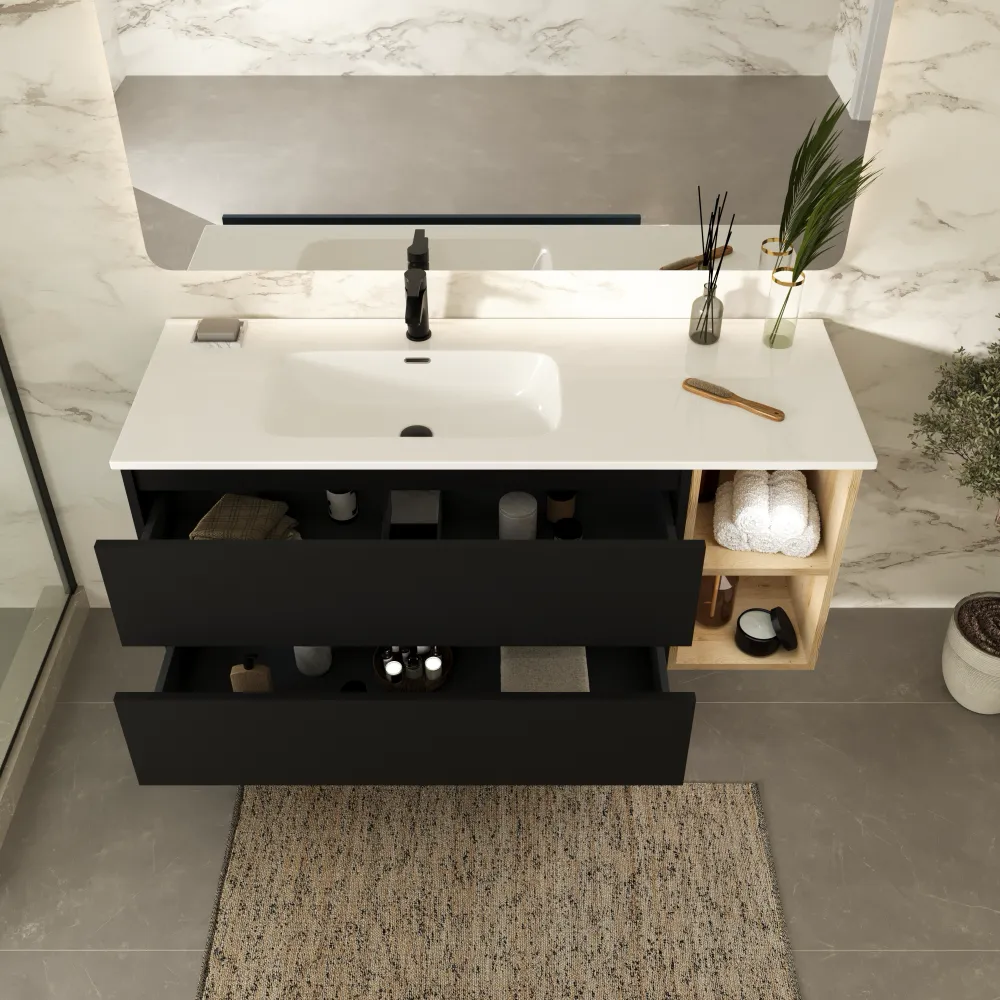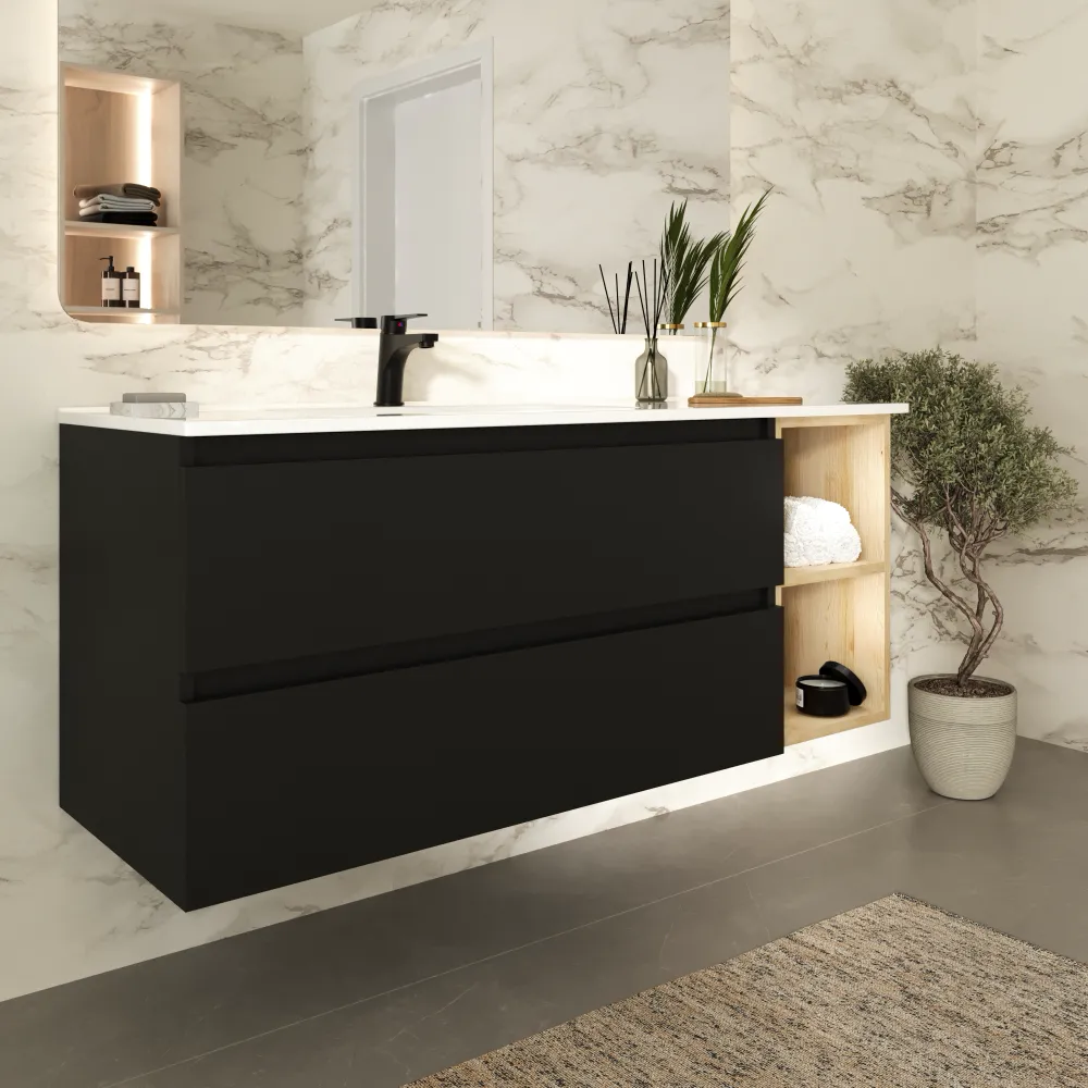 Mobile bagno sospeso 90cm due cassetti nero opaco con lavabo sinistro e vano a giorno rovere chiaro stone oak | Hexa