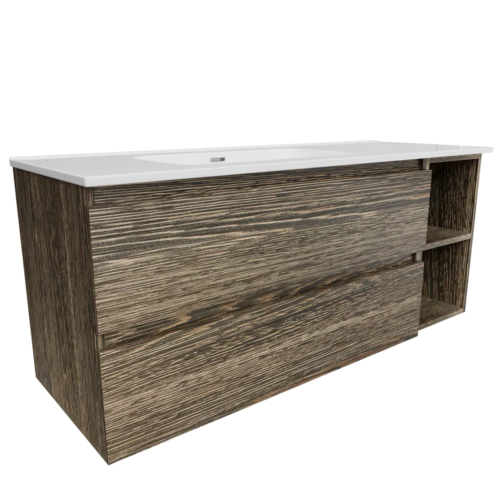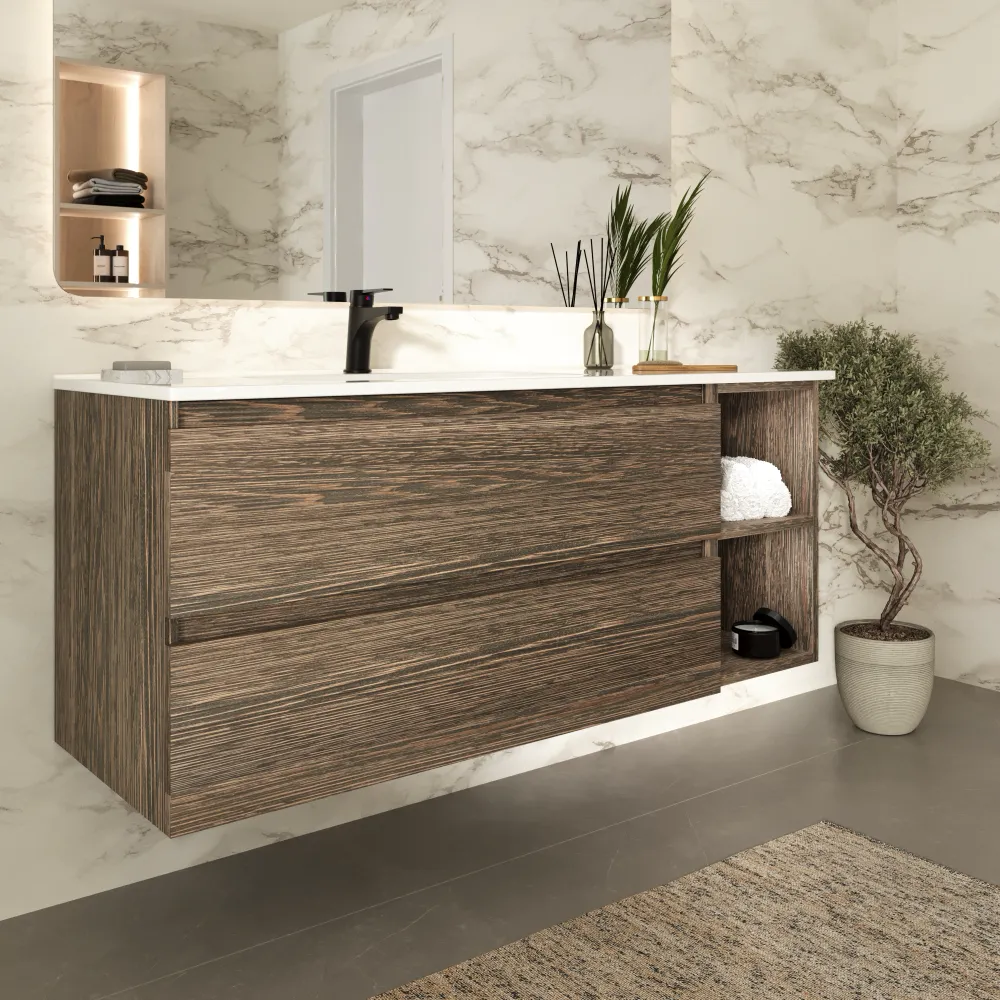Mobile bagno sospeso 90cm due cassetti rovere scuro vintage wenge con lavabo sinistro e vano a giorno | Hexa