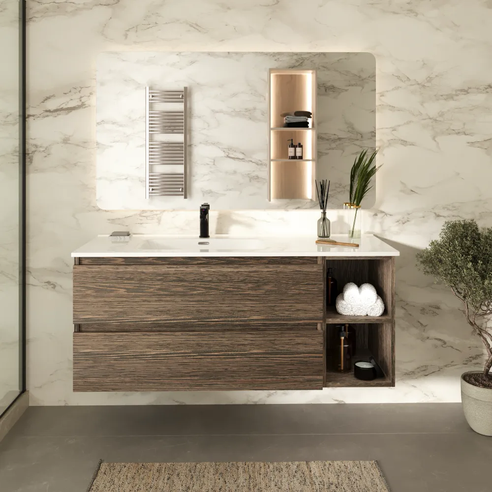 Il mobile da bagno Hexa 90 cm in elegante finitura rovere scuro vintage wenge offre un perfetto equilibrio tra estetica moderna e praticità, grazie alla sua composizione modulare. La struttura è realizzata in legno nobilitato, spesso 18mm, materiale stabile e resistente all’umidità, ideale per garantire durata e affidabilità nel tempo.