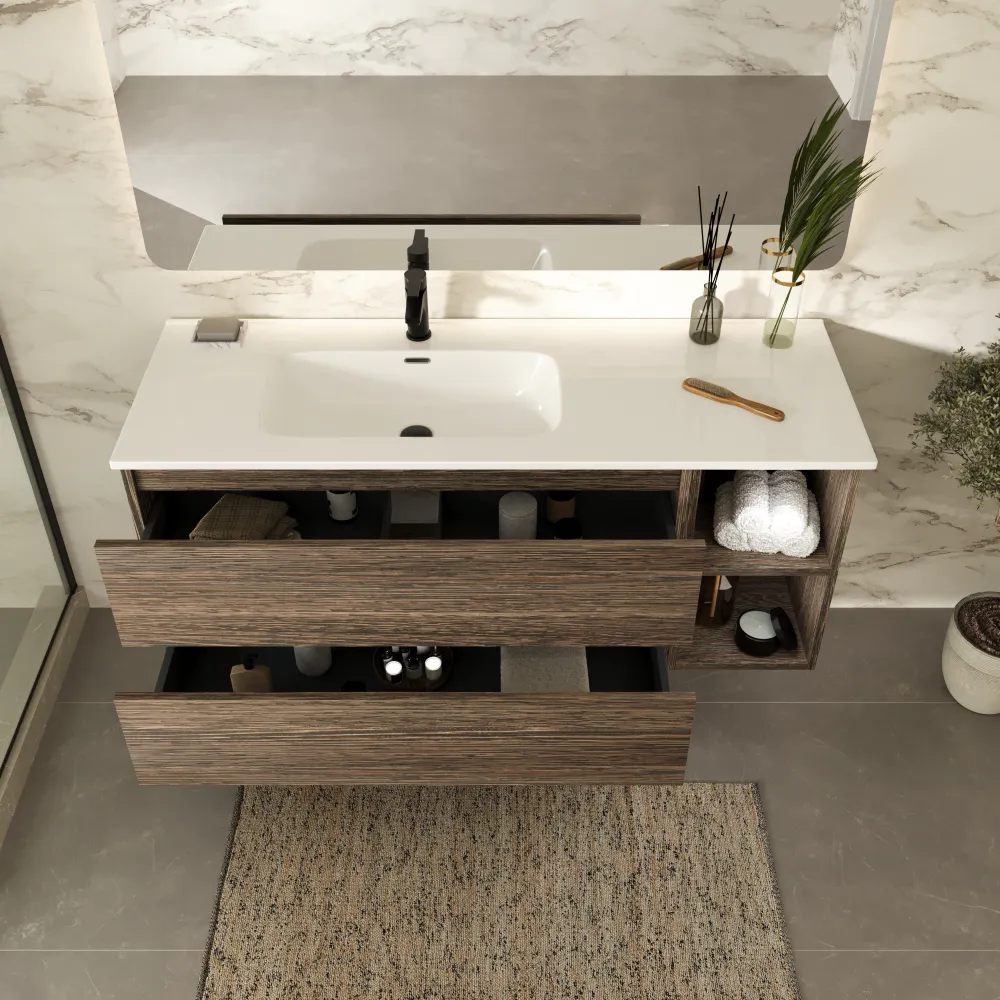 La composizione è formata da un mobile da 60 cm con due cassetti, progettati per un’organizzazione ottimale: il primo cassetto è sagomato per accogliere il sifone, mentre il secondo, più profondo, è ideale per riporre asciugamani, prodotti ingombranti e scorte. A lato è presente un pensile da 30 cm con due scomparti a giorno, perfetti per oggetti decorativi o per tenere a portata di mano i prodotti di uso frequente.