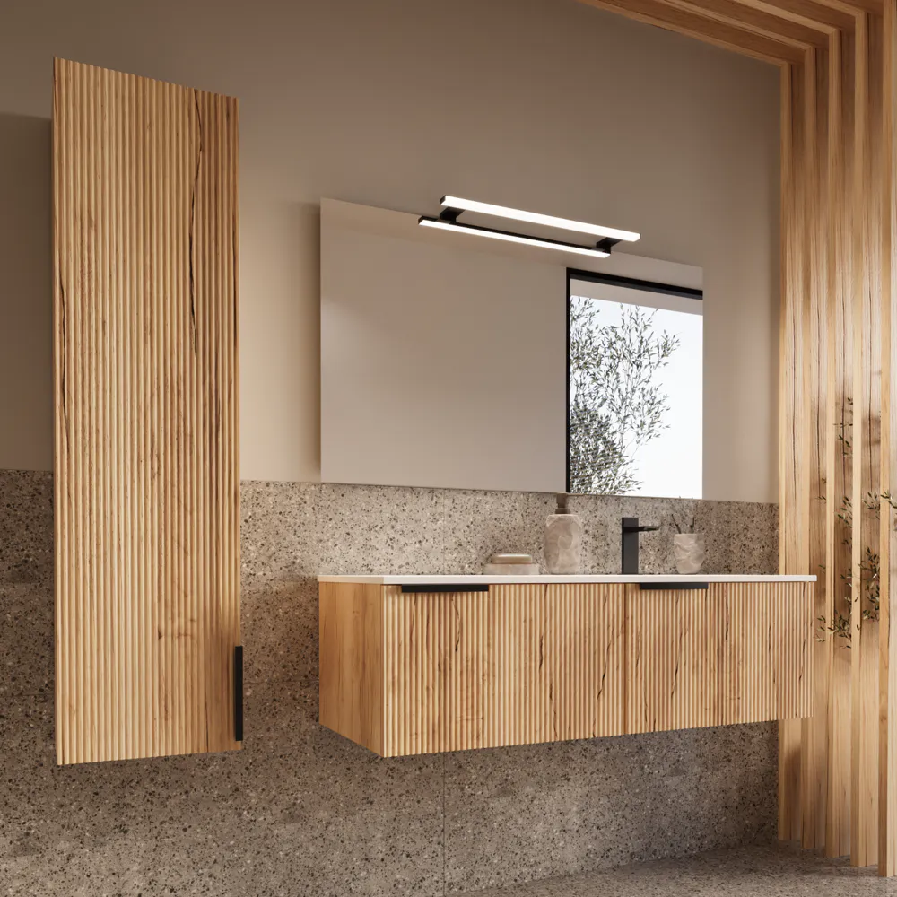 Il mobile da bagno Fuji conquista al primo sguardo grazie alla sua raffinata lavorazione cannettata, che dona ritmo e movimento alle superfici creando un sofisticato gioco di luci e ombre. Un design tridimensionale che non si limita a valorizzare l’estetica, ma trasforma l’intero ambiente bagno in uno spazio contemporaneo, elegante e ricercato.