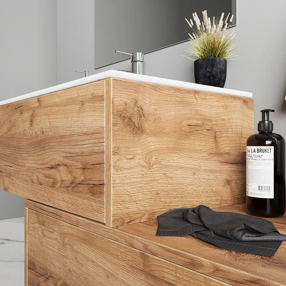 La finitura rovere gransasso conferisce al mobile un tocco di calore e naturalezza. Le venature del legno creano un piacevole contrasto con la modernità delle linee e la luminosità del lavabo bianco.