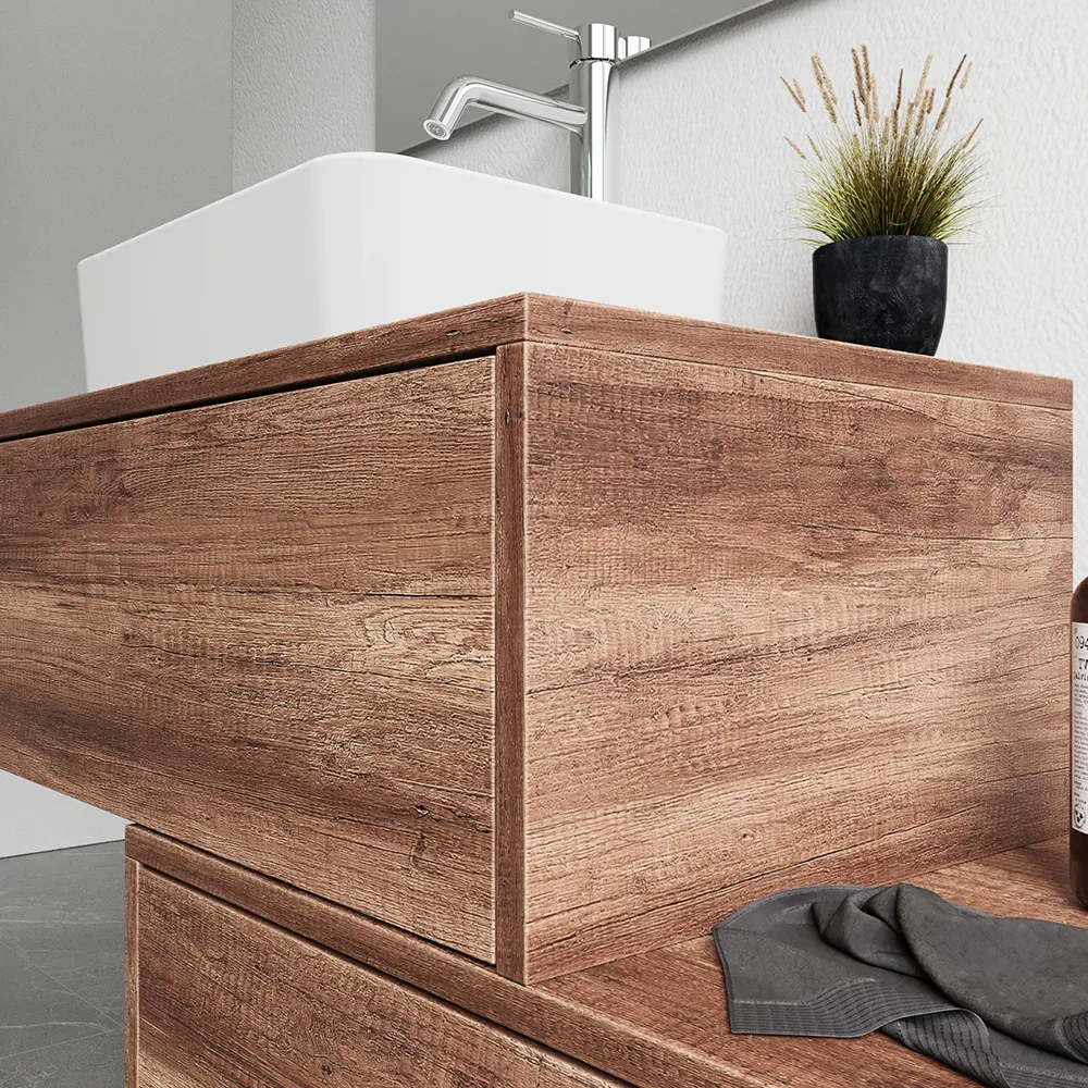 I due cassetti sono dotati di un sistema di apertura Push&Pull, un meccanismo che elimina la necessità di maniglie, contribuendo a un'estetica pulita e minimalista. La chiusura soft-close è un valore aggiunto che garantisce un'esperienza d'uso piacevole e silenziosa, evitando urti e prolungando la vita del mobile. Il top spazioso è progettato per accogliere un lavabo d'appoggio, dando maggiore libertà di scelta nel design e nella personalizzazione del tuo bagno.