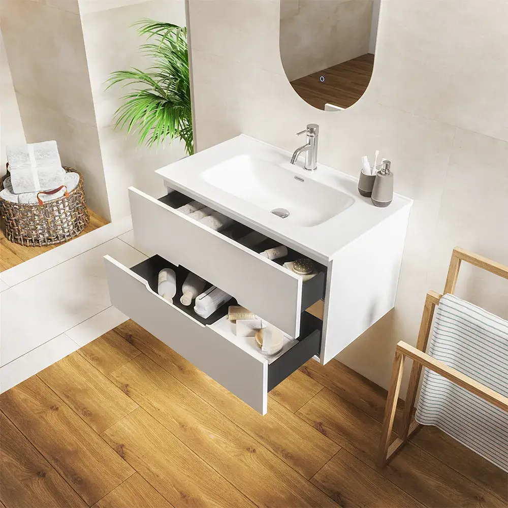 Mobile da bagno sospeso 60cm bianco opaco con cassetti soft-close, apertura con gole sagomate, lavabo in ceramica incluso