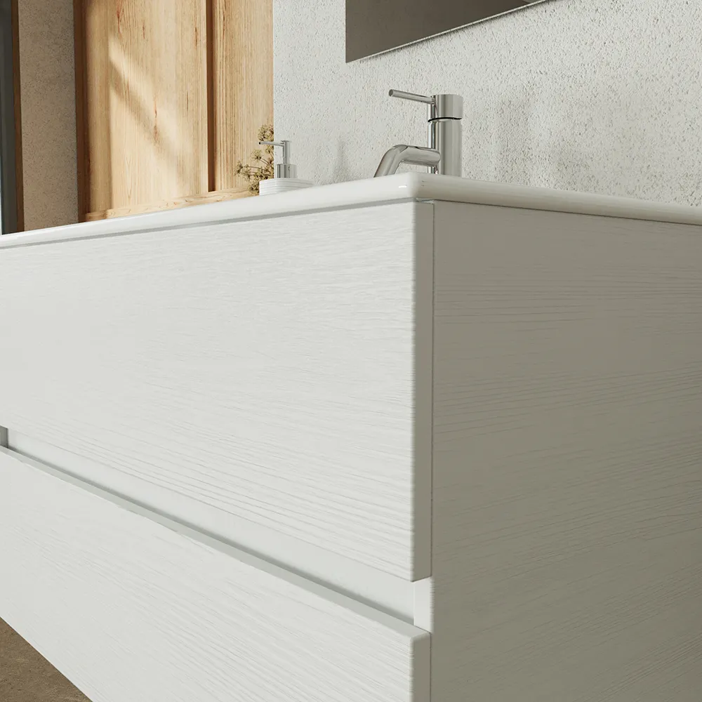 Questo mobile è strutturato interamente in legno MDF con finitura bianco effetto legno, per garantire solidità, resistenza all'acqua ed una lunga vita utile del prodotto. Yili è inoltre dotato di due cassetti a chiusura rallentata (Soft-close) che garantiscono un movimento fluido e silenzioso, mettendo il mobile al riparo da brusche chiusure e riducendone l'usura nel tempo.