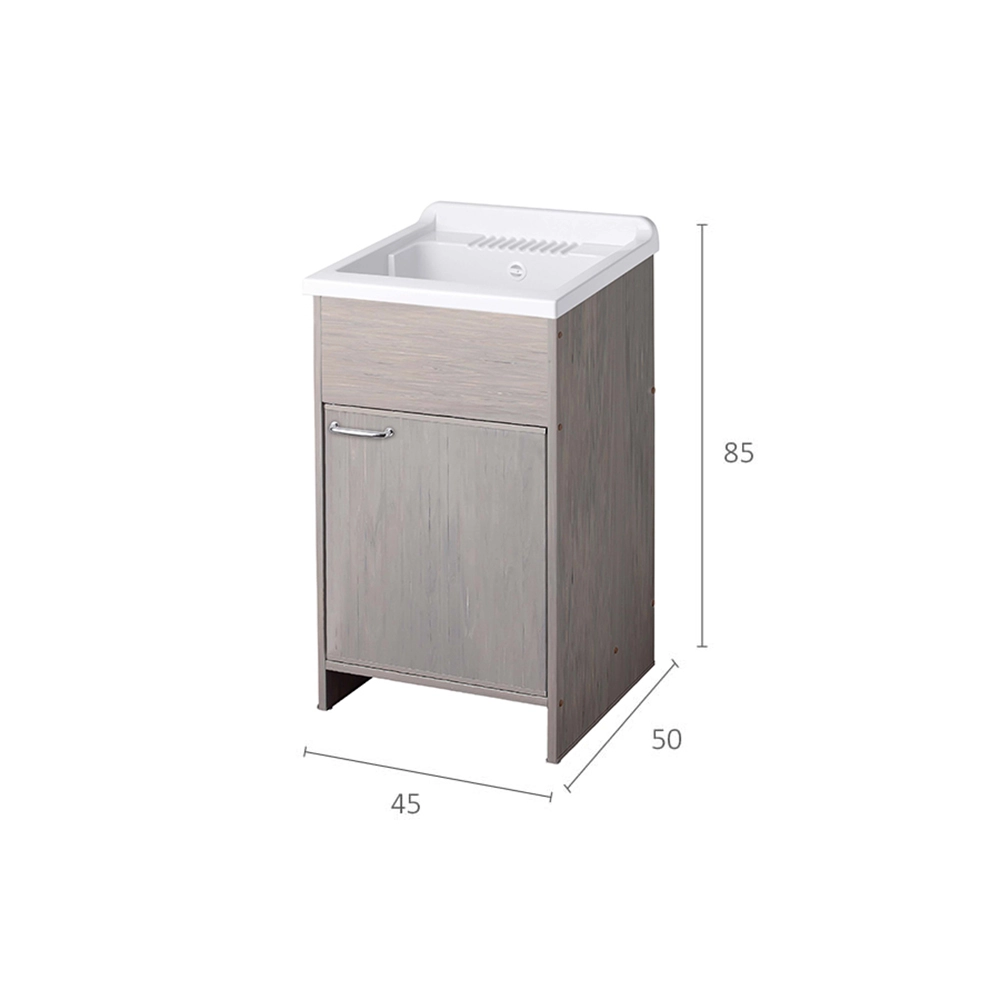 Con le sue dimensioni 45x50 cm è dotato di un'ampia vascaplastica PP bianca, che contrasta piacevolmente con la finitura in rovere chiaro del resto del mobile. Questo abbinamento di colori dona un tocco di calore e raffinatezza a qualsiasi spazio esterno.