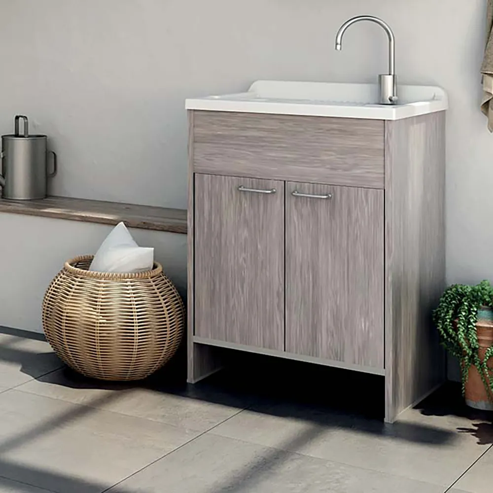 Con le sue dimensioni 60x50 cm è dotato di un'ampia vasca in plastica PP bianca, che contrasta piacevolmente con la finitura in rovere chiaro del resto del mobile. Questo abbinamento di colori dona un tocco di calore e raffinatezza a qualsiasi spazio esterno.