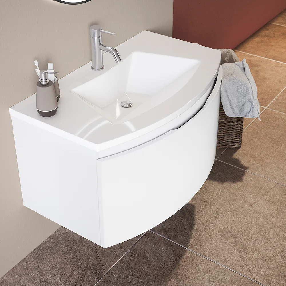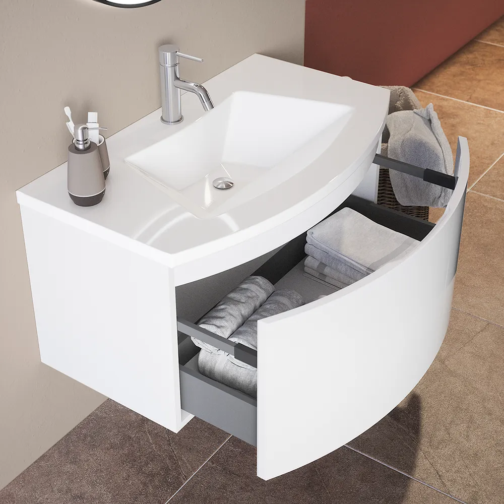Mobile sospeso 100 cm bianco lucido con un cassetto e lavabo in ceramica, frontale curvo | Lula