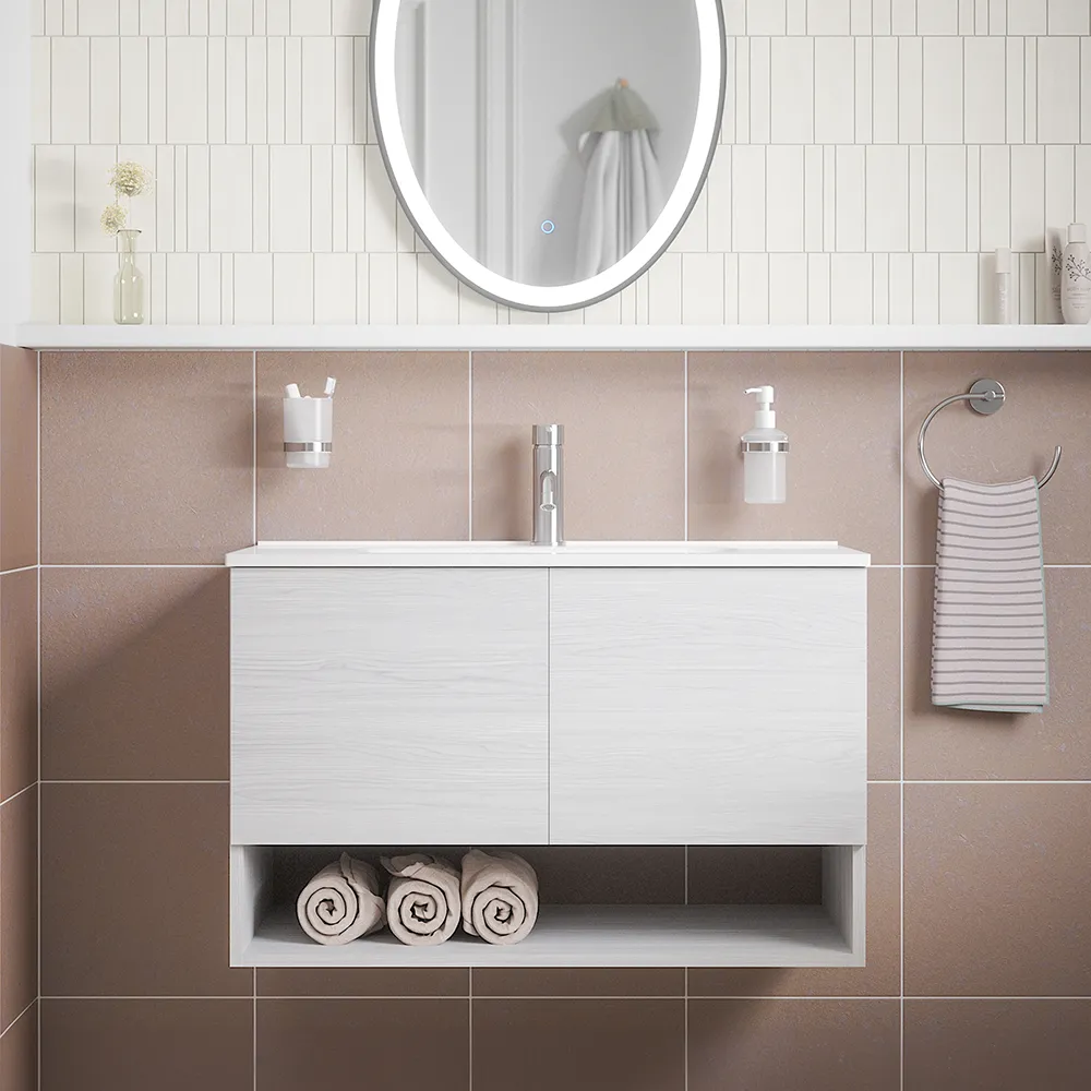 Il mobile sospeso con 2 ante e vano a giorno da 60 cm in bianco effetto legno è la soluzione perfetta per arredare il tuo bagno con stile e praticità.
