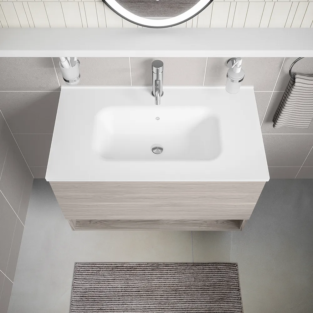 Il lavabo integrato in ceramica completa il mobile con eleganza, offrendoti una superficie liscia e piacevole al tatto, facile da pulire e resistente all'usura. La sua forma essenziale si sposa perfettamente con le linee minimaliste del mobile, creando un insieme armonioso e raffinato.