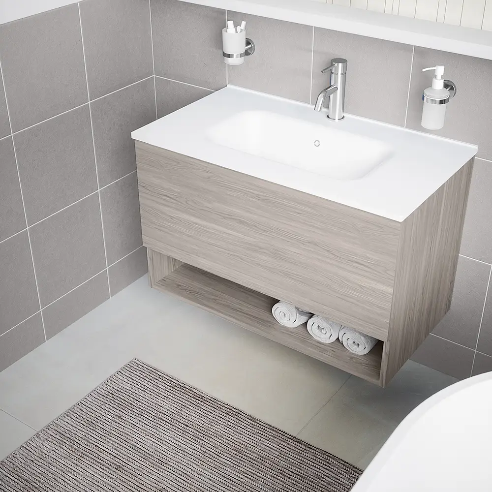 Mobile sospeso 60 cm rovere grigio con un cassetto, vano a giorno e lavabo | Sauris