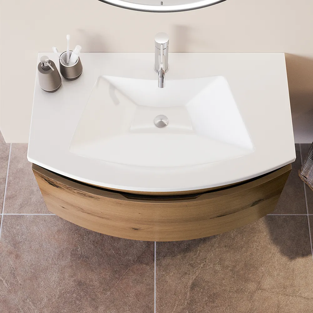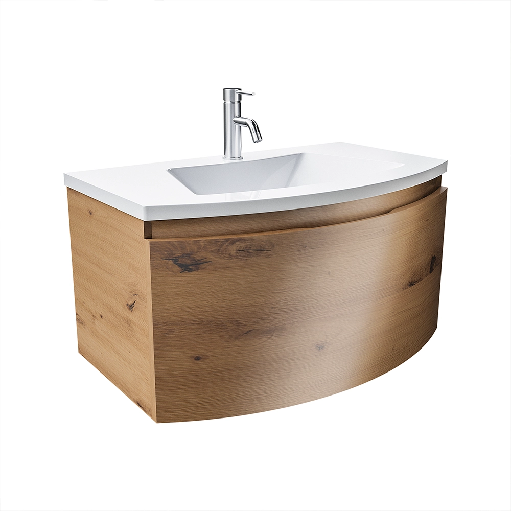 Mobile sospeso 80 cm rovere oro con un cassetto e lavabo in ceramica, frontale curvo | Lula
