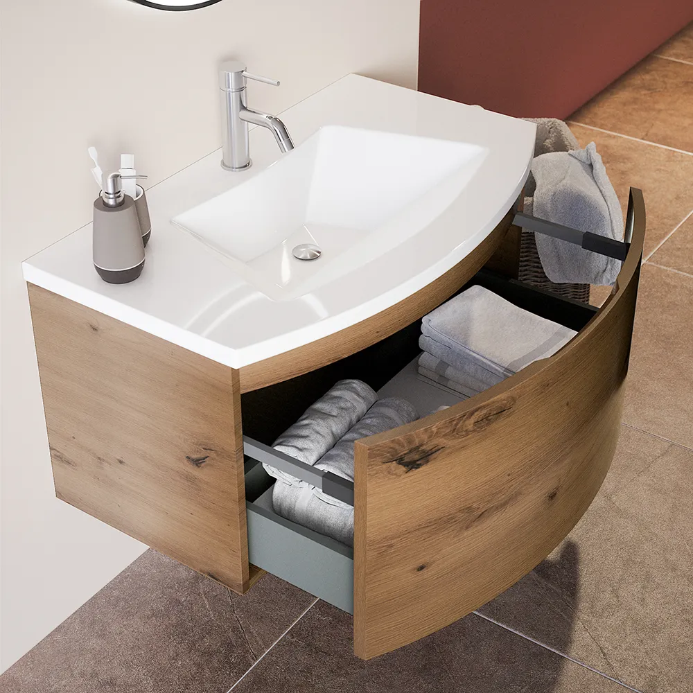 Con il suo design moderno e sinuoso, caratterizzato da un frontale curvo che cattura l'attenzione, questo mobile si distingue per la sua personalità e il suo stile inconfondibile. Il suo ampio cassetto ti consentirà di riporre in modo ordinato tutto ciò che ti serve per la tua routine quotidiana. La chiusura rallentata, inoltre, garantisce una chiusura silenziosa e controllata.