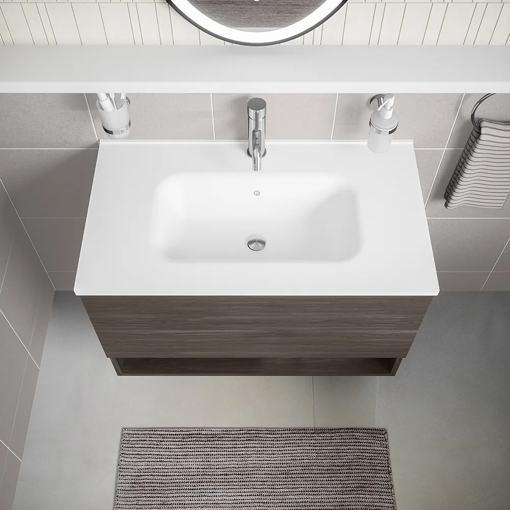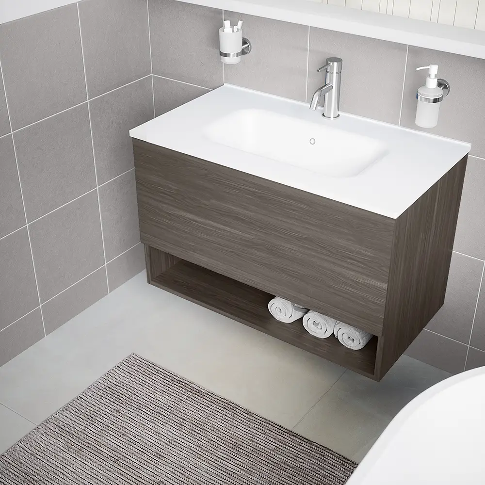 Mobile sospeso 80 cm rovere scuro con un cassetto, vano a giorno e lavabo | Sauris