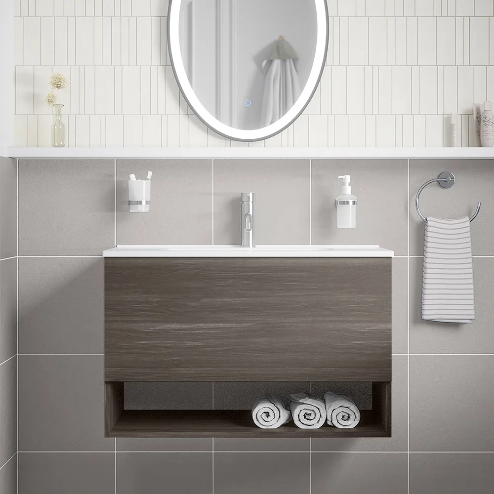 Il mobile sospeso con 1 cassetto e vano a giorno da 80 cm in rovere scuro è la soluzione perfetta per arredare il tuo bagno con stile e praticità.