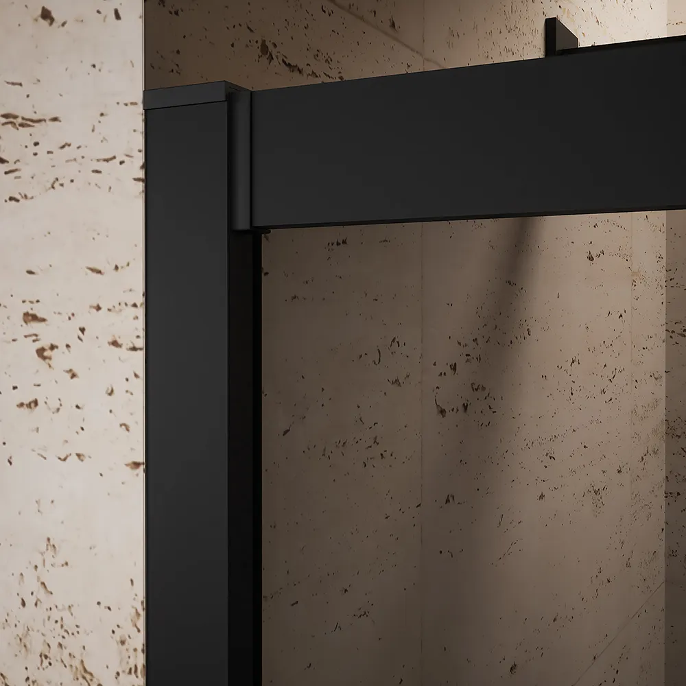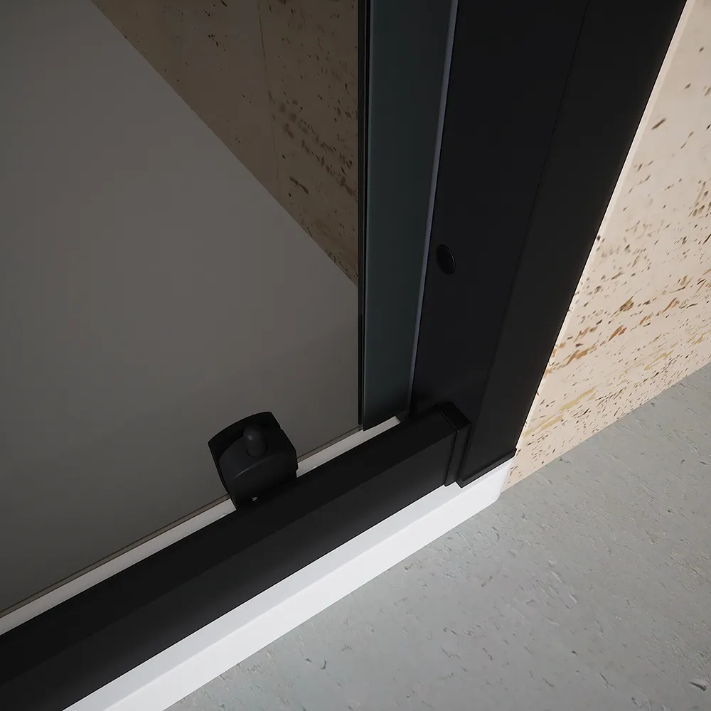 Lasciati affascinare dalla brillantezza dei profili in alluminio nero opaco e dall'eleganza del vetro fumè da 6 mm, certificato secondo lo standard EN12150-1. Goditi un'apertura fluida e silenziosa grazie ai carrelli con cuscinetti in acciaio inox e cover in ABS cromata. Il meccanismo quick-release facilita la pulizia profonda della porta per una manutenzione semplice e veloce.