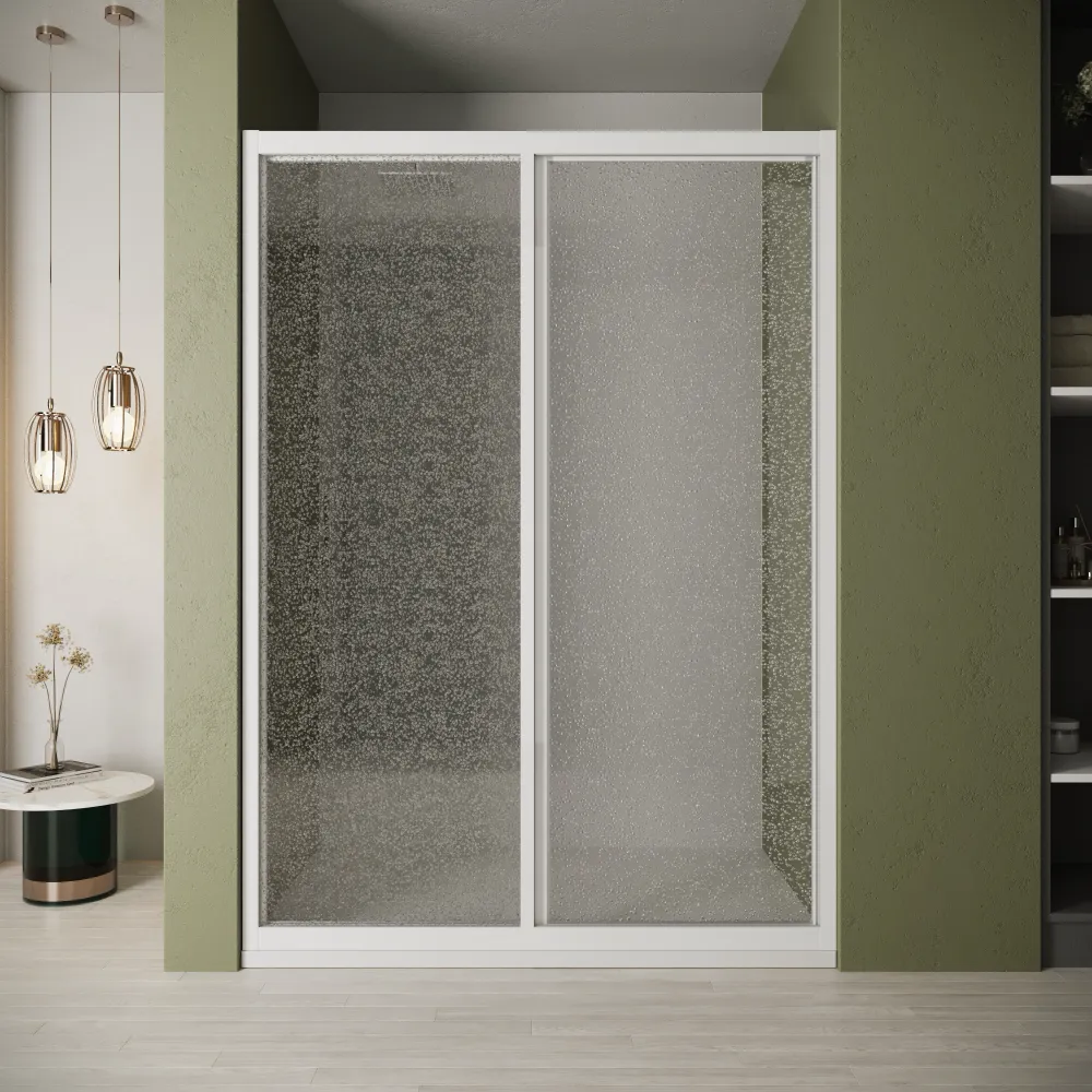 Nicchia doccia 140cm apertura scorrevole profili bianchi in pvc e pannello acrilico 1,8mm h190cm