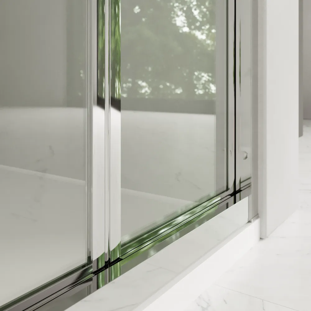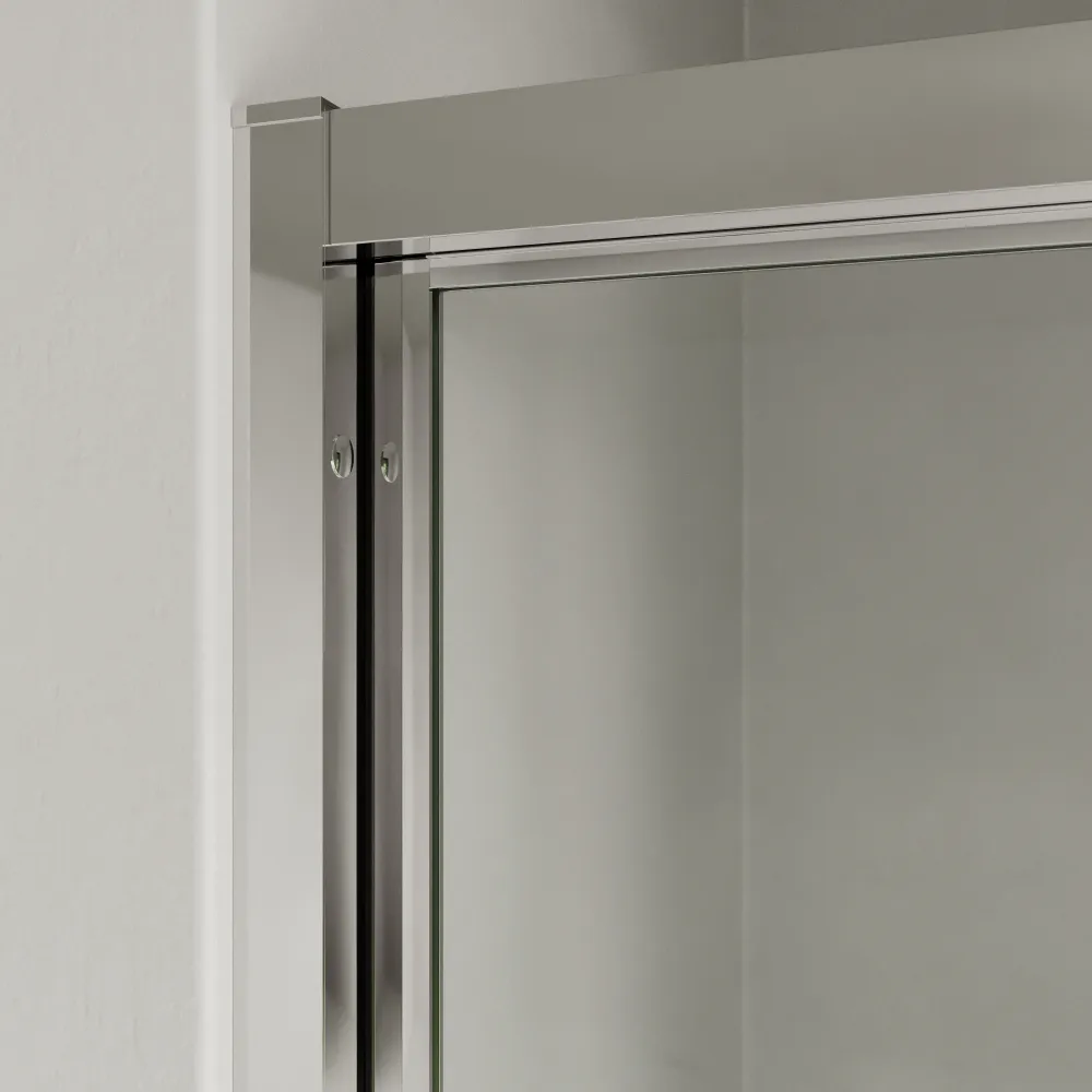 I profili cromati aggiungono brillantezza e modernità, mentre il vetro trasparente da 6 mm mantiene la visibilità e la luminosità nell’ambiente bagno.