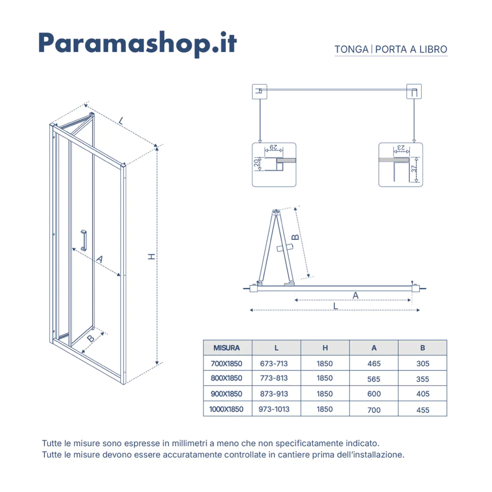 Nicchia doccia 70 cm apertura a libro profili cromati vetro 6mm trasparente h185 | Tonga