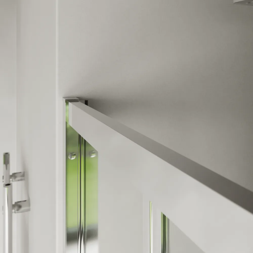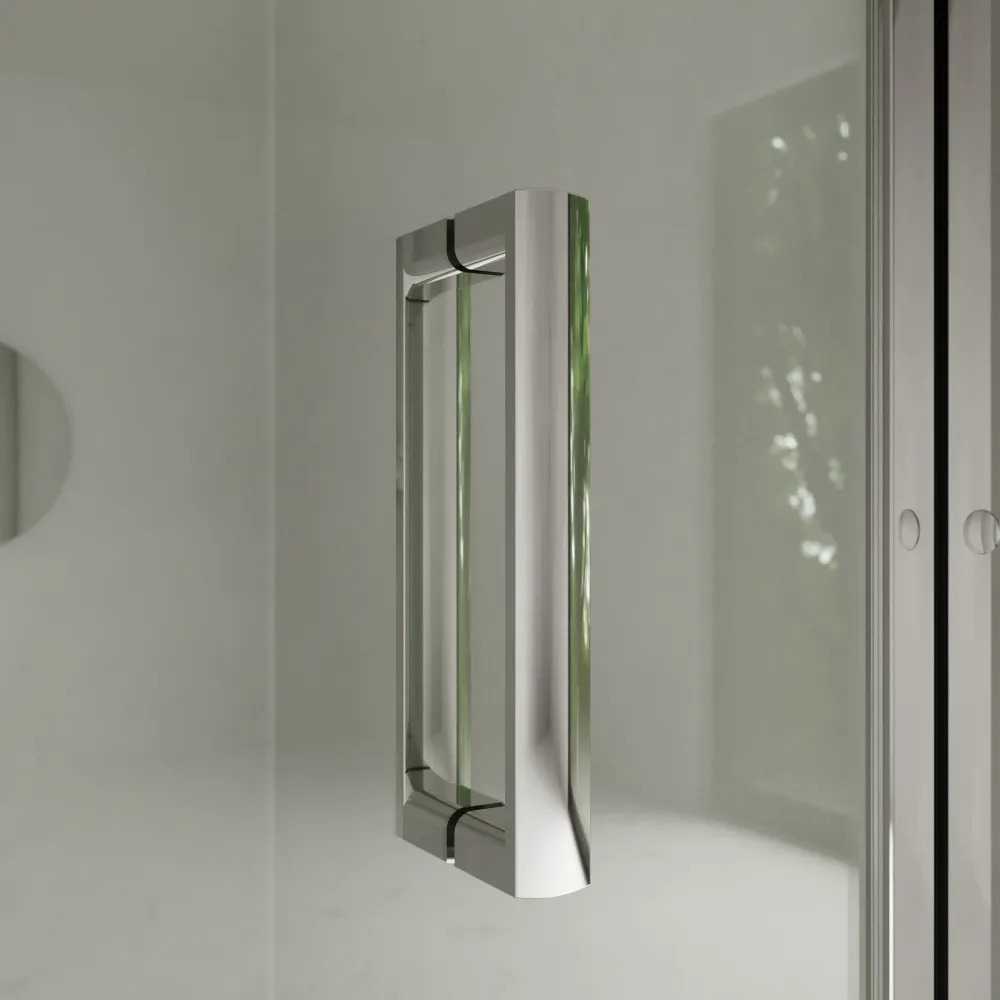 La maniglia in ABS cromata dal design squadrato e le guarnizioni magnetiche assicurano una chiusura stabile, ermetica e un’estetica impeccabile, completando la funzionalità della porta a libro.