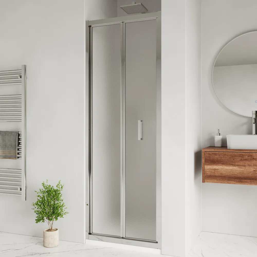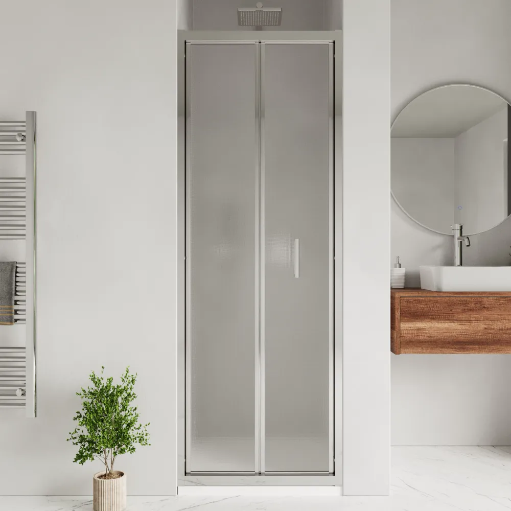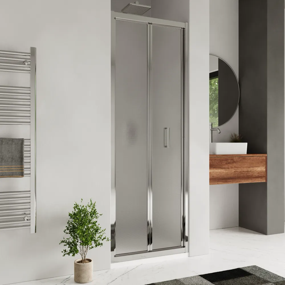 Rinnova la tua nicchia doccia con questa porta a libro da 90cm, progettata per unire eleganza, praticità e funzionalità salvaspazio. Il vetro stampato garantisce privacy senza rinunciare alla luminosità.