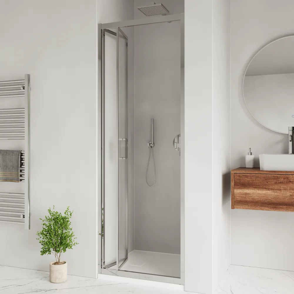 Grazie al meccanismo a libro, la porta si ripiega su sé stessa, permettendo un ingresso comodo anche in bagni piccoli o stretti. Massimizza lo spazio senza sacrificare il comfort.