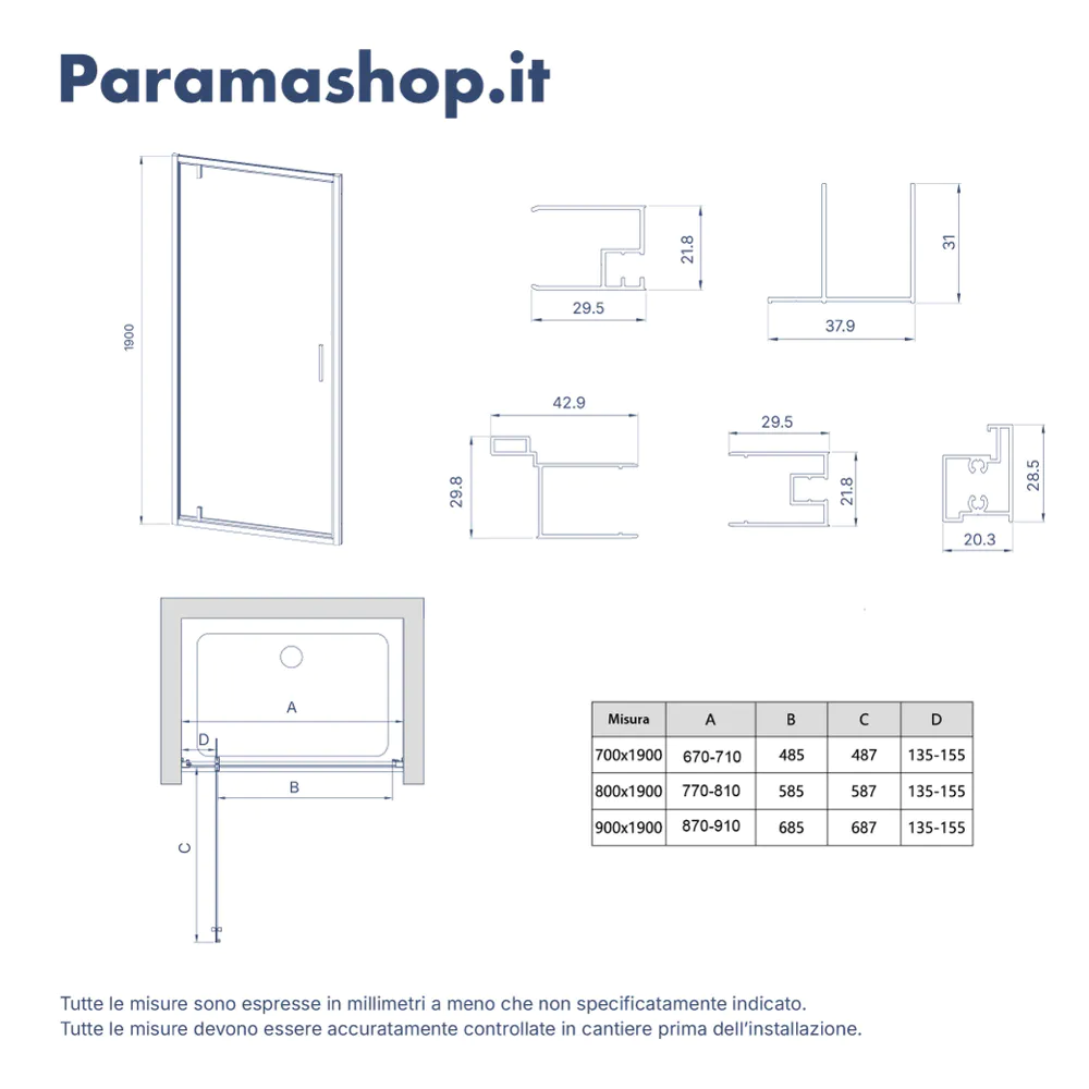 Nicchia slim a battente 70cm profili cromati vetro 6mm opaco anticalcare h190 | Lerici