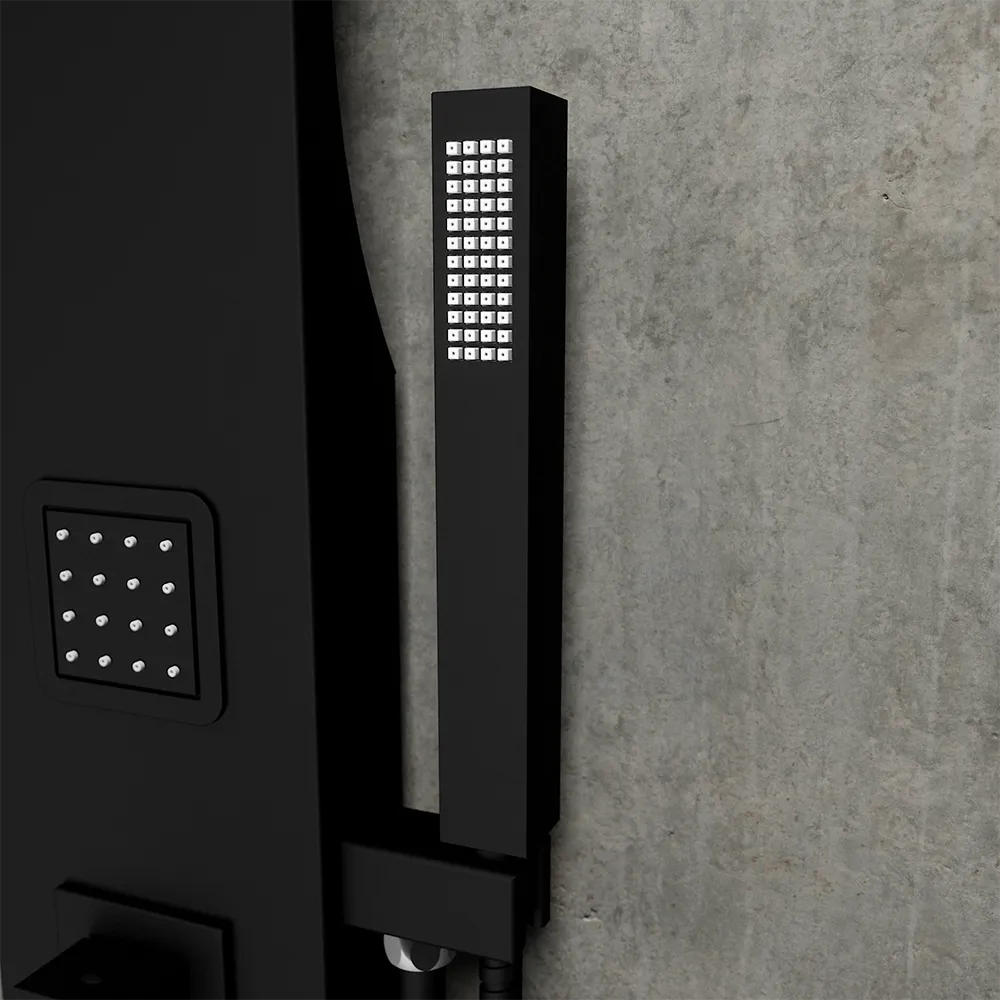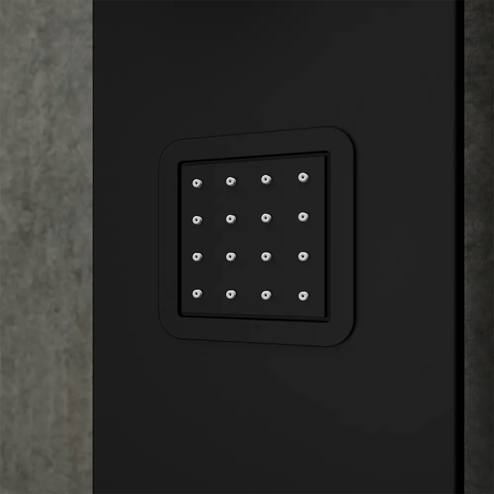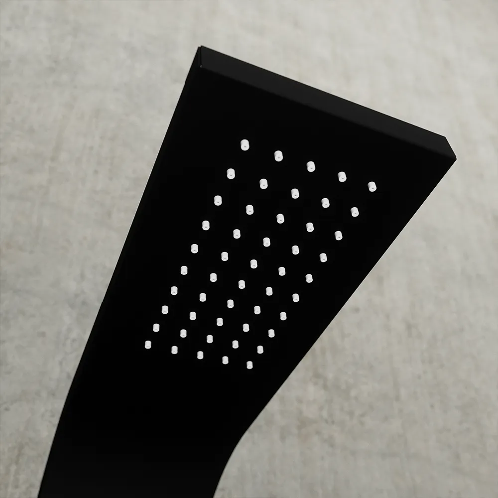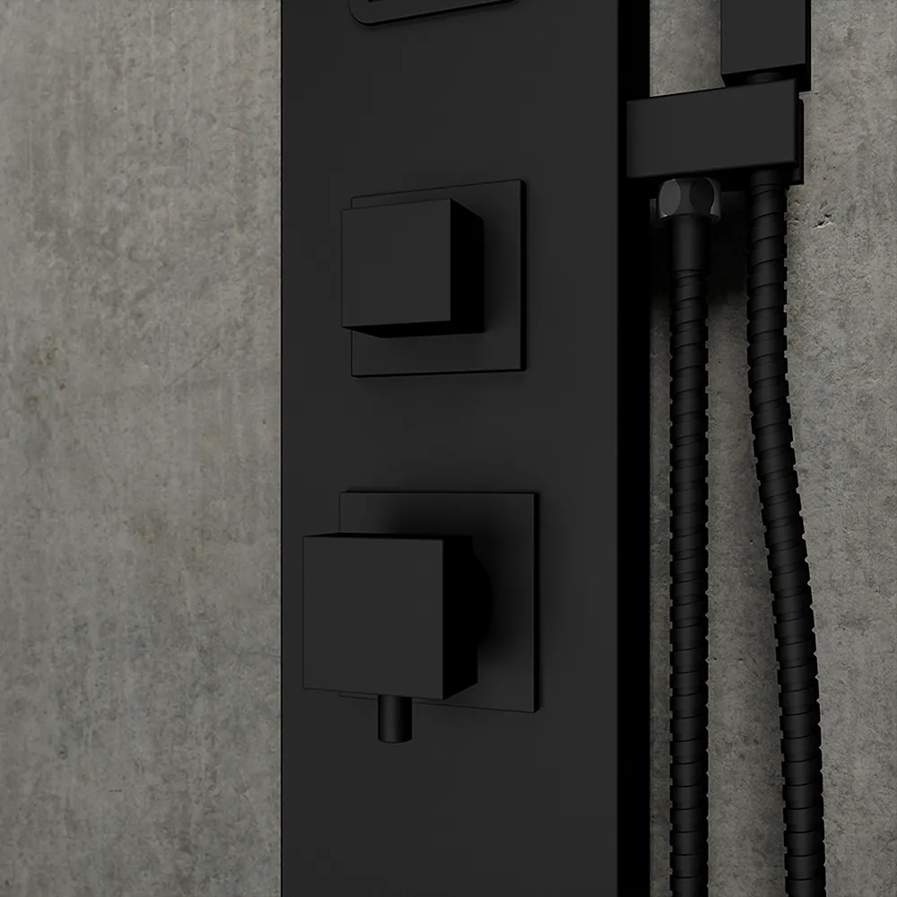 Realizzato in alluminio con finitura nero opaco, questo pannello doccia si distingue per il suo design elegante e minimalista. Il materiale garantisce resistenza alla corrosione, leggerezza e una manutenzione semplice.