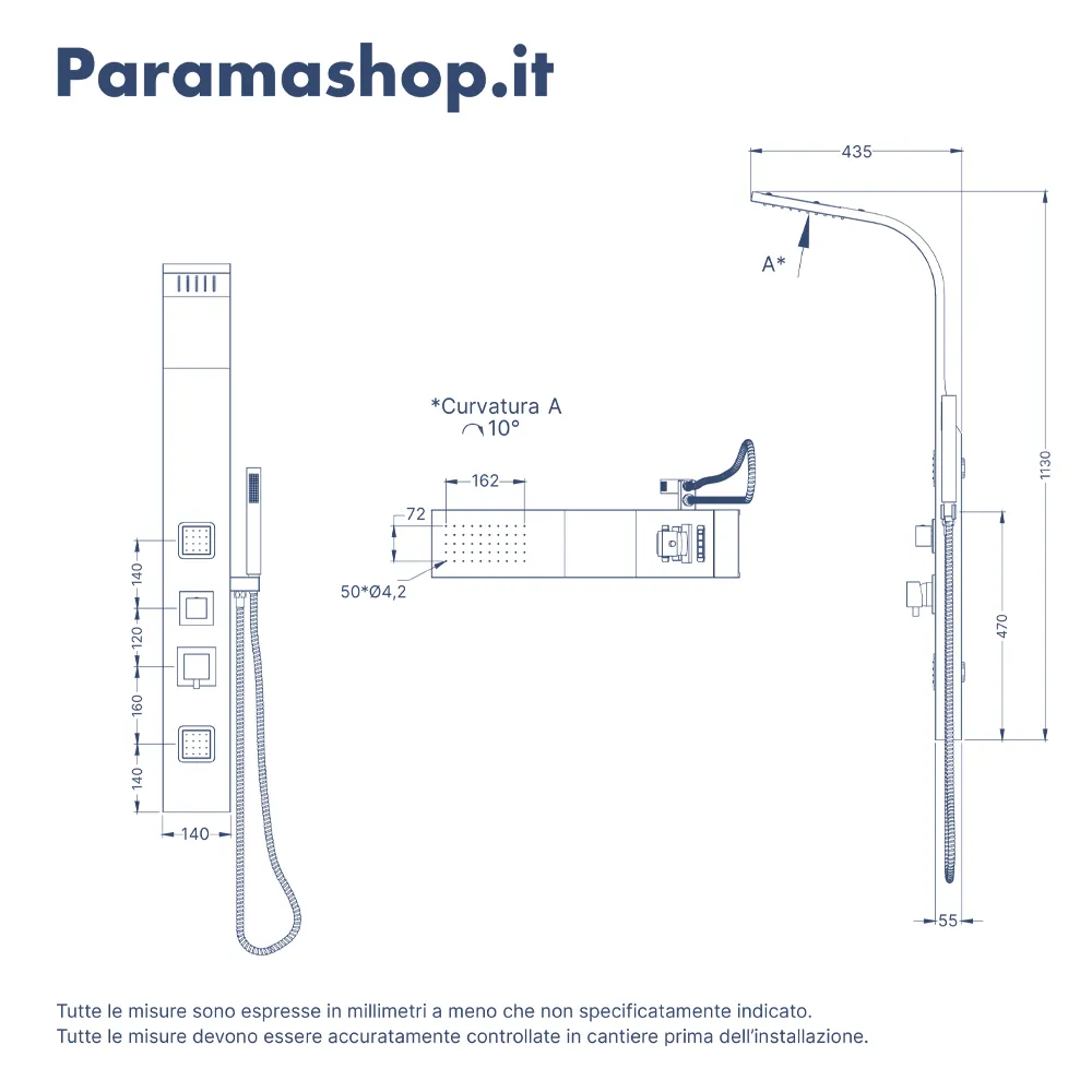 Gestire le funzioni del pannello è semplice e immediato: grazie al deviatore integrato, puoi passare dal soffione superiore ai getti idromassaggio fino al doccino con un solo gesto. Il miscelatore con corpo in ottone ti consente di dosare acqua calda e fredda con estrema precisione, garantendo sempre la temperatura ideale.