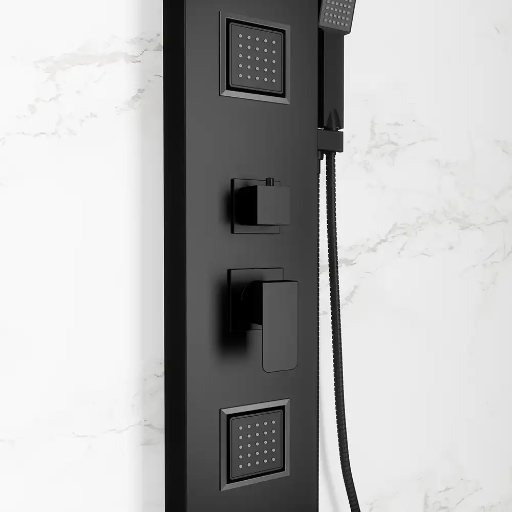 Pannello doccia in alluminio nero opaco a 4 funzioni con soffione, cascata, doccetta e getti idromassaggio modello Laja